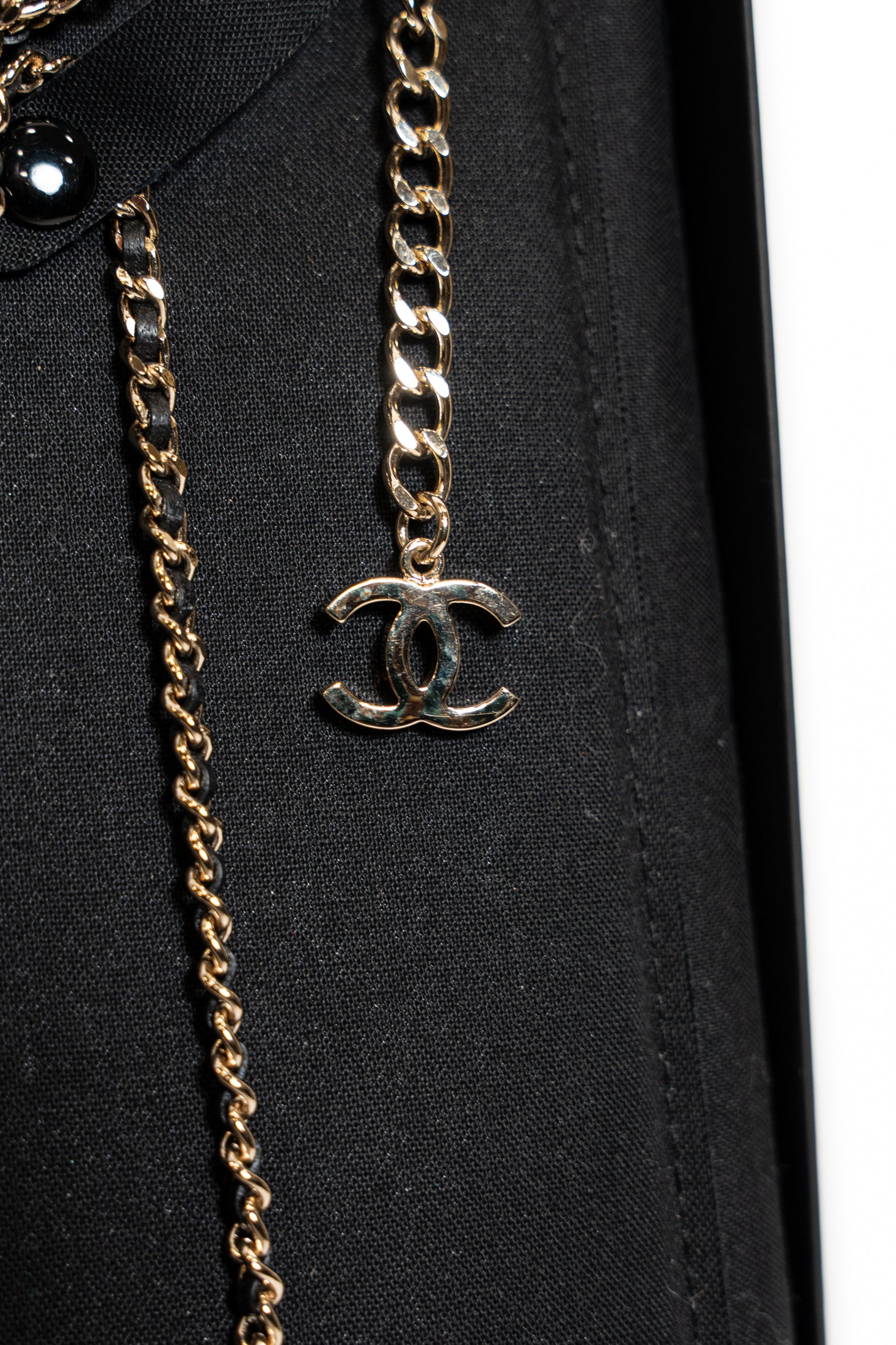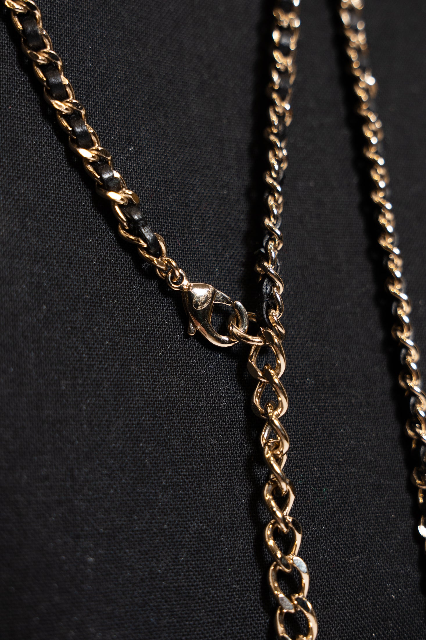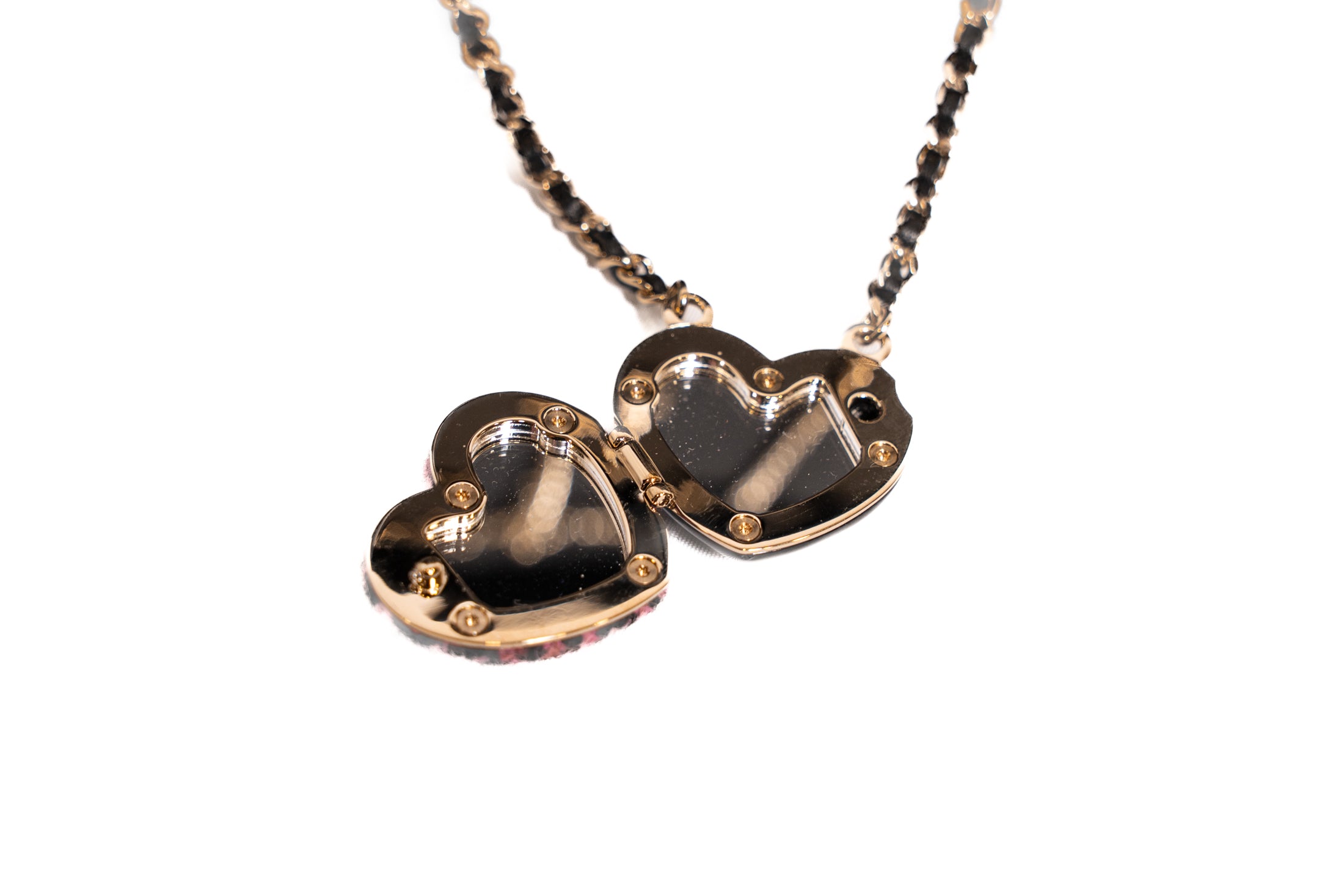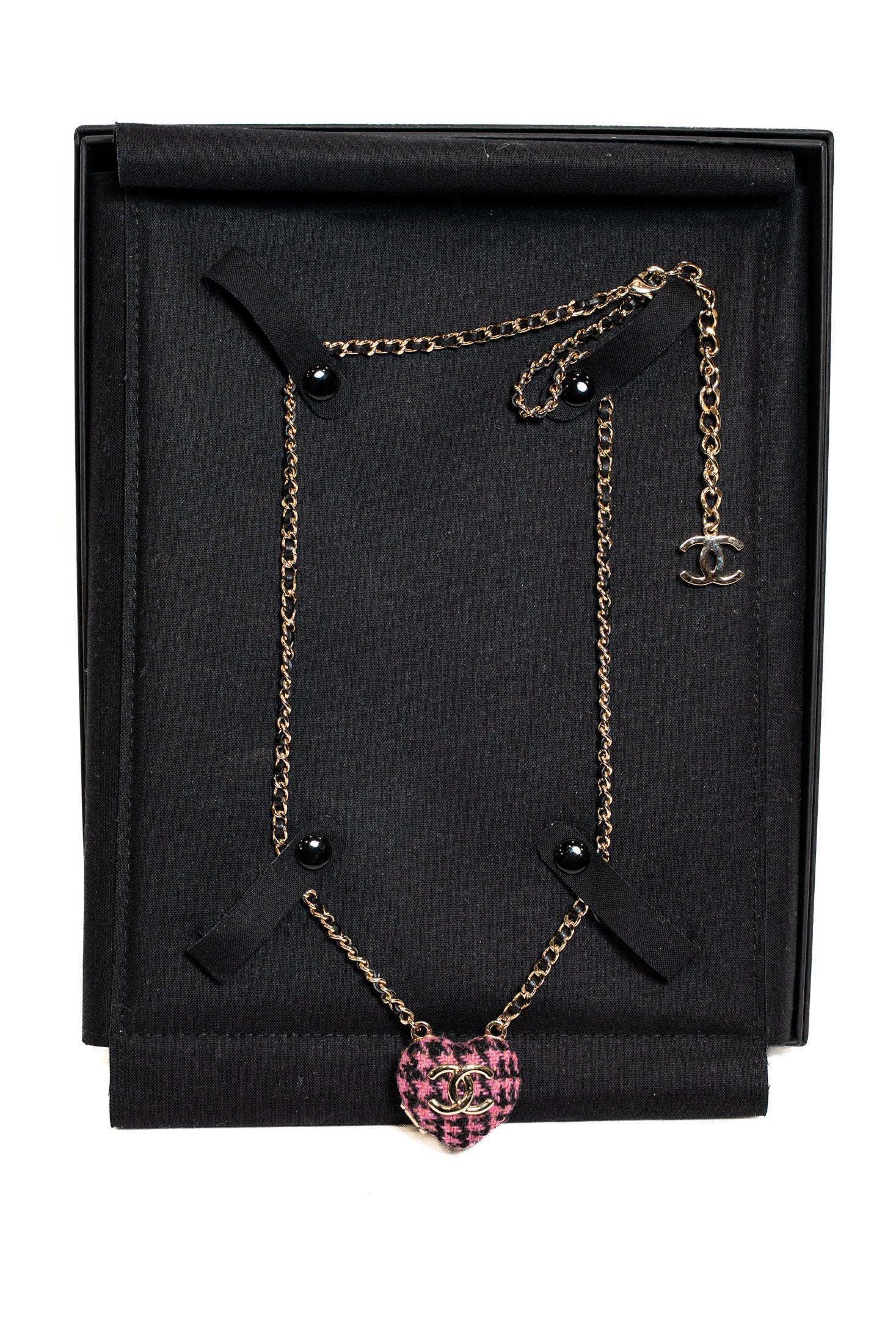 Collier CHANEL en cuir entrelacé. Pendentif en coeur tweed rose.
