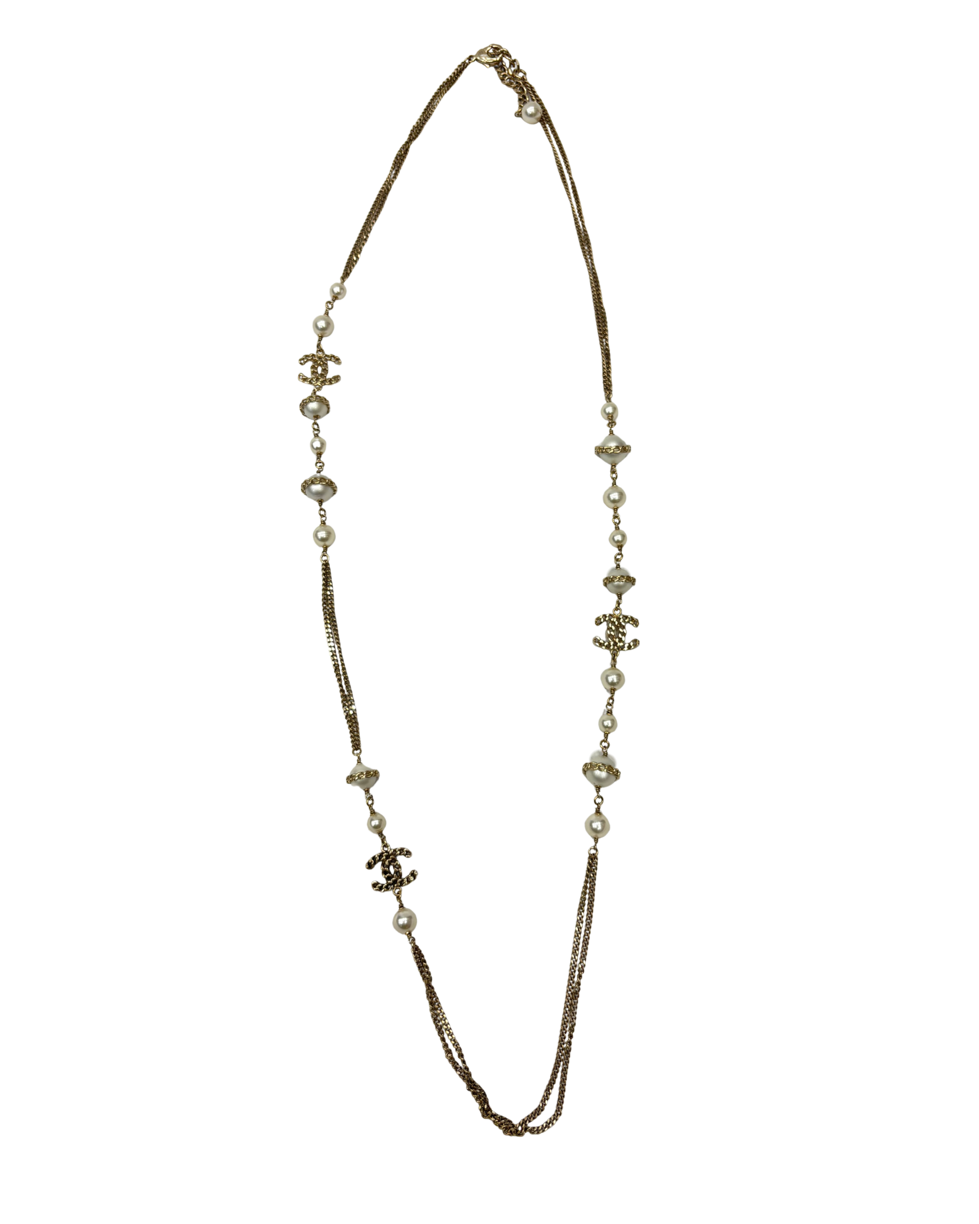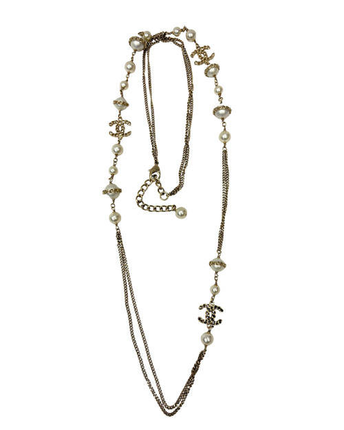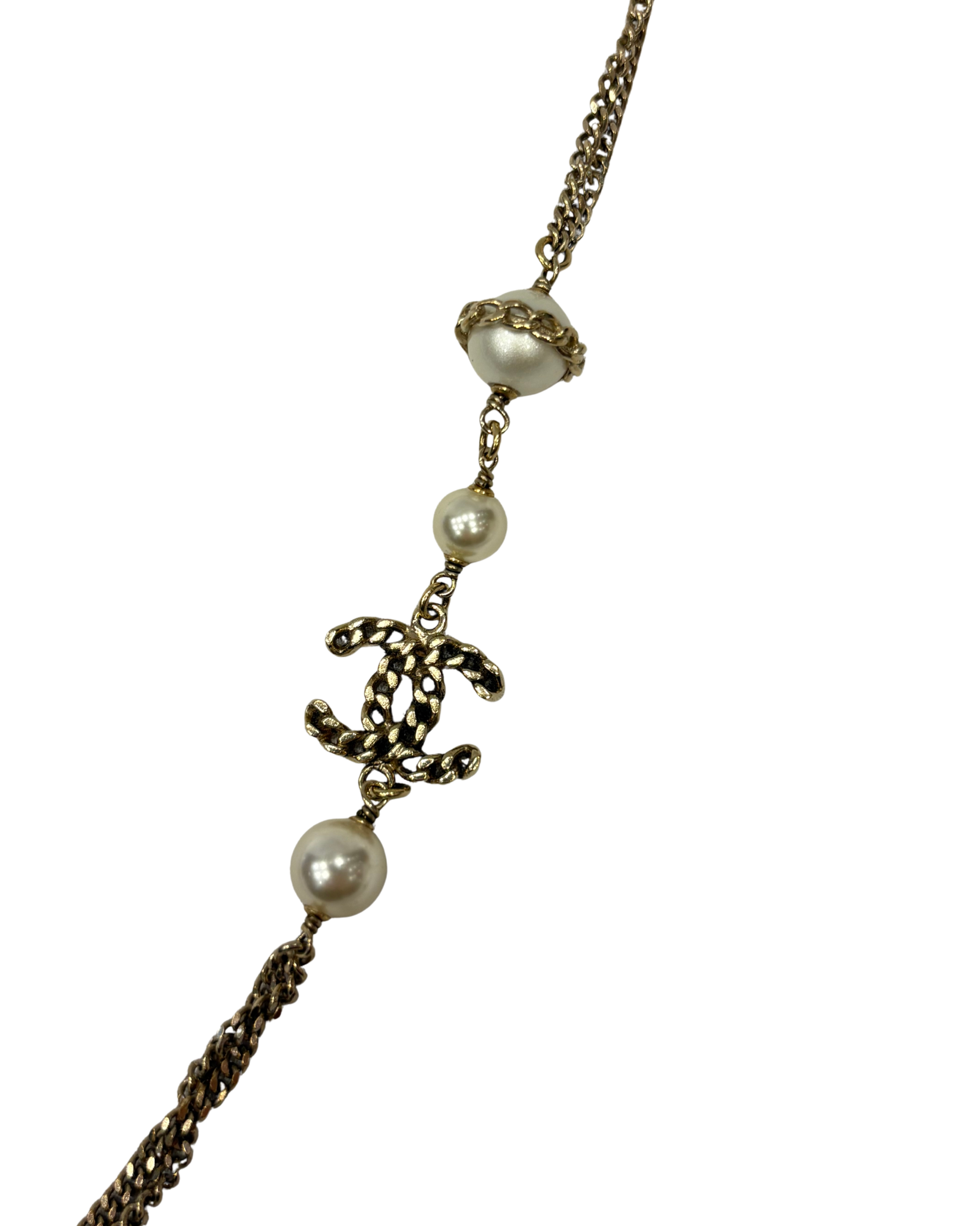Sautoir Chanel en très bon état général, composé de perles et de CC. Vendu avec sa boîte d’origine.