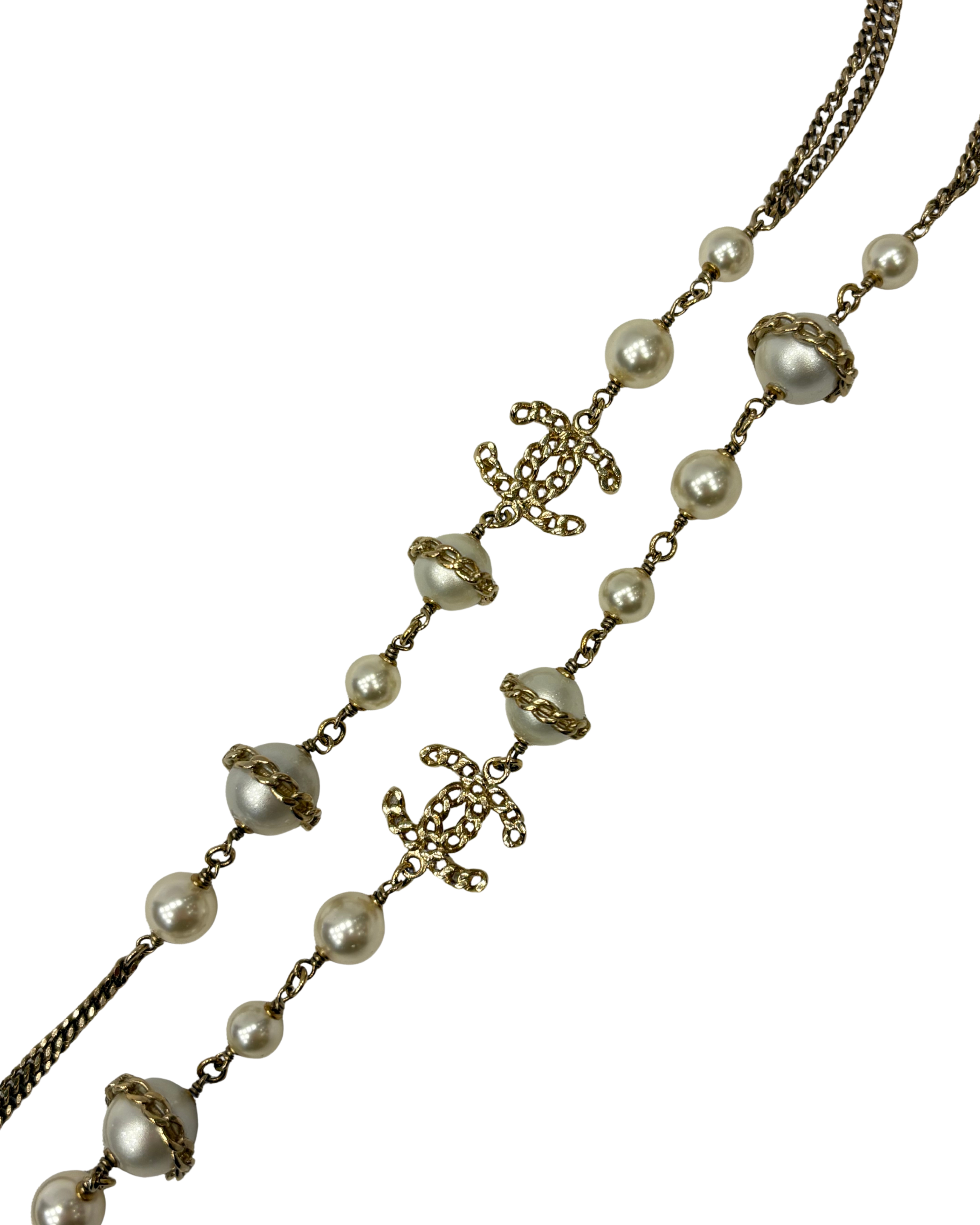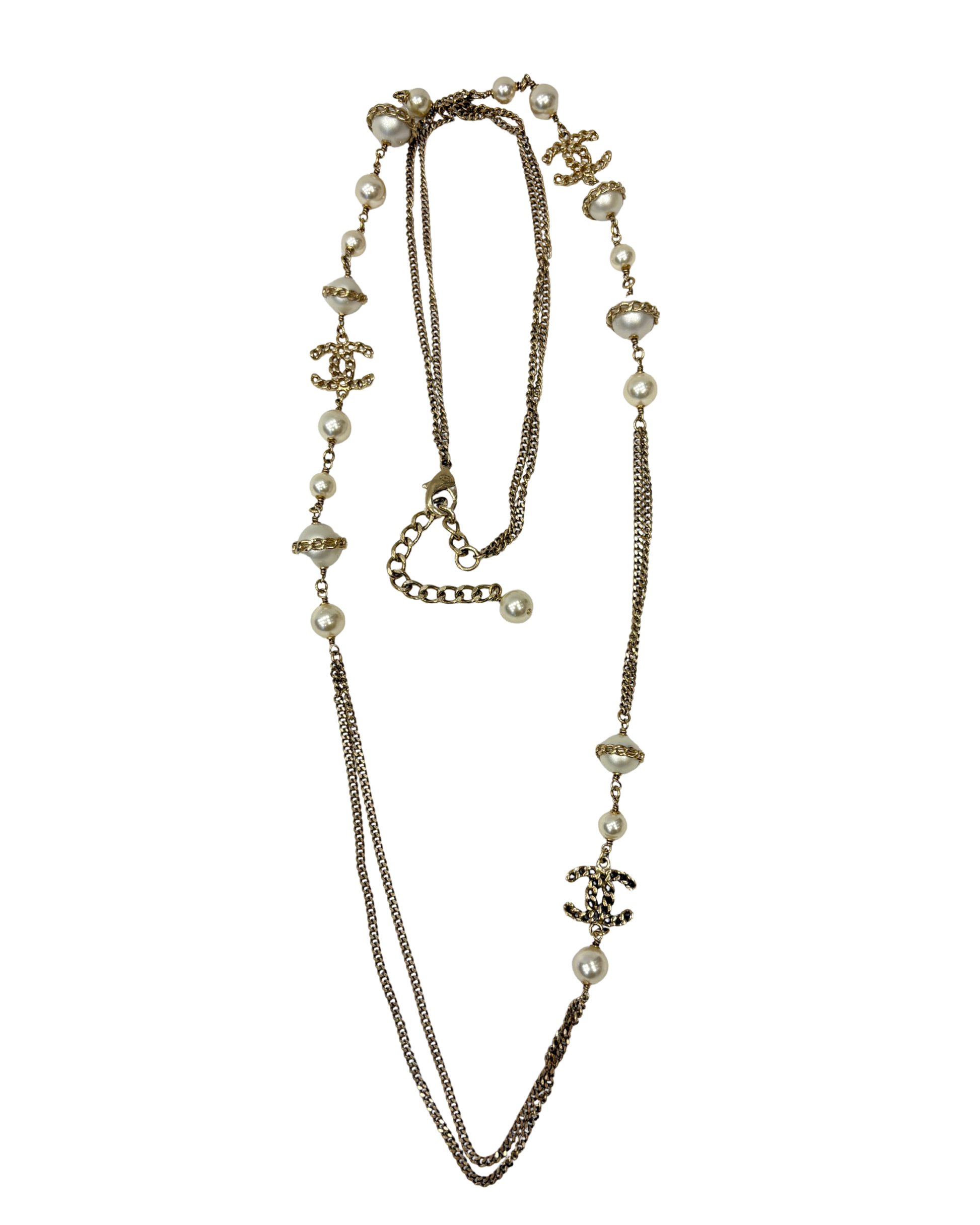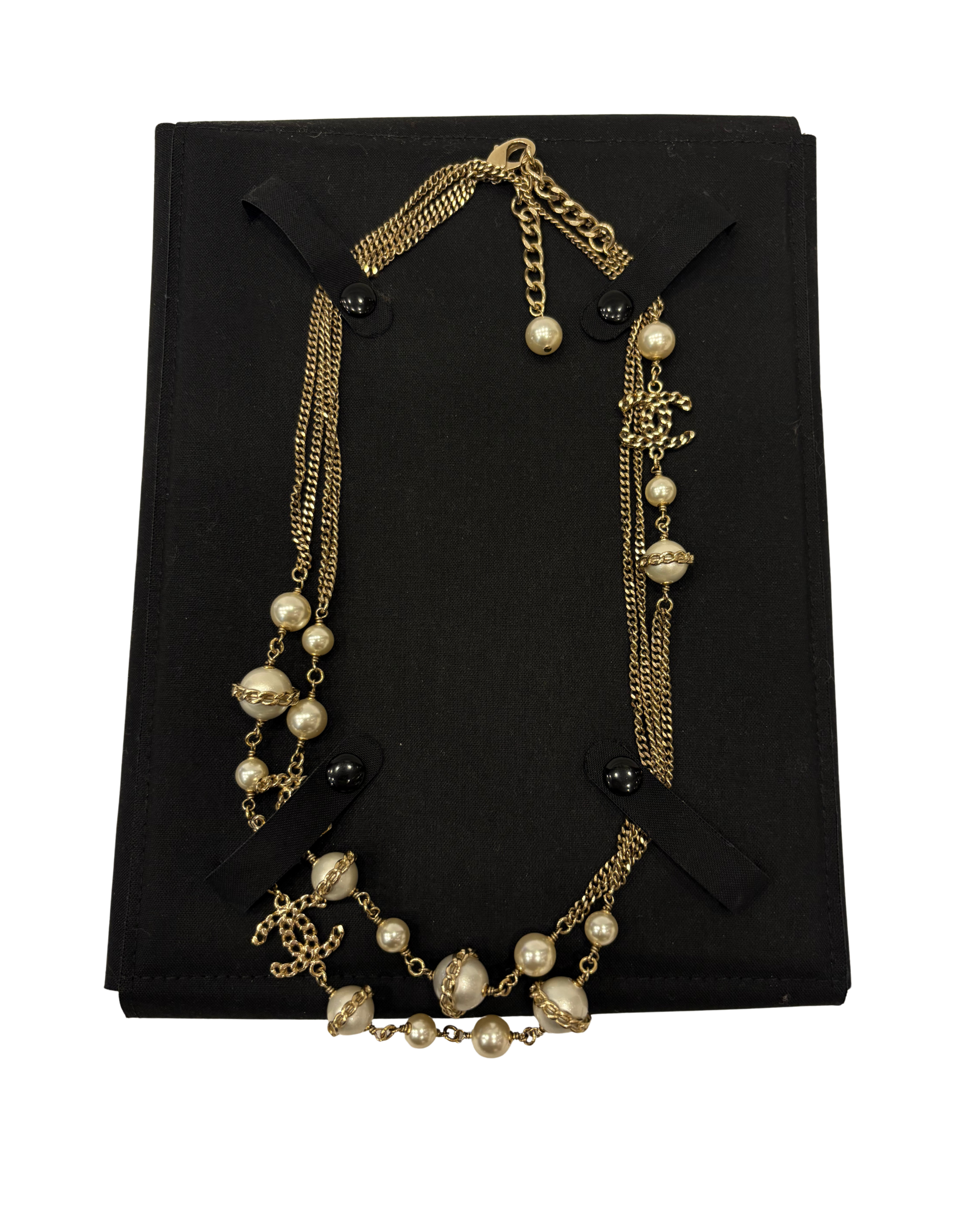 Sautoir Chanel en très bon état général, composé de perles et de CC. Vendu avec sa boîte d’origine.