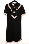 Robe mi-longue GUCCI en viscose noire gansée de rose. manche courte. col avec volant retenu par une tête de lion en métal bronze.