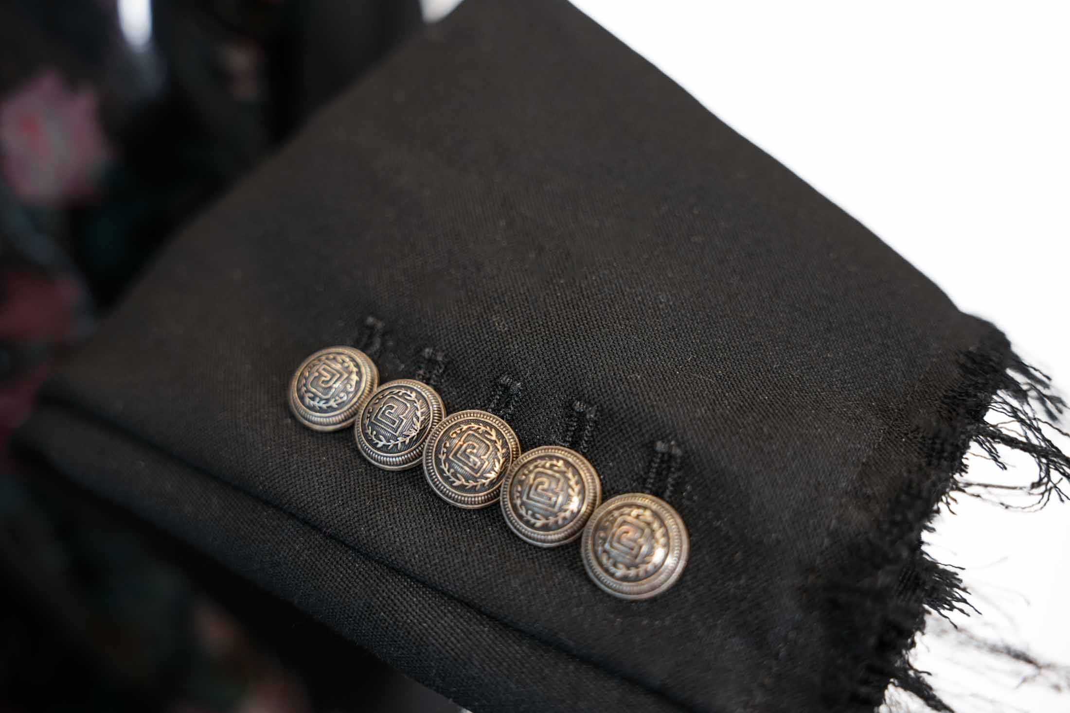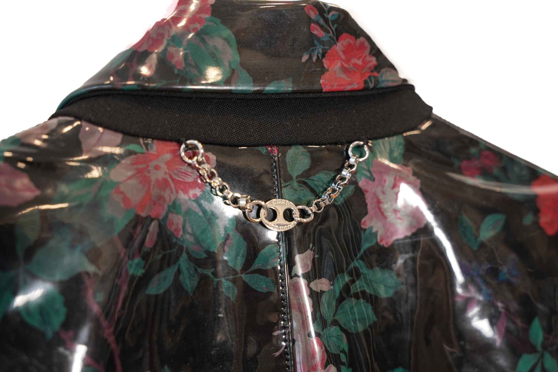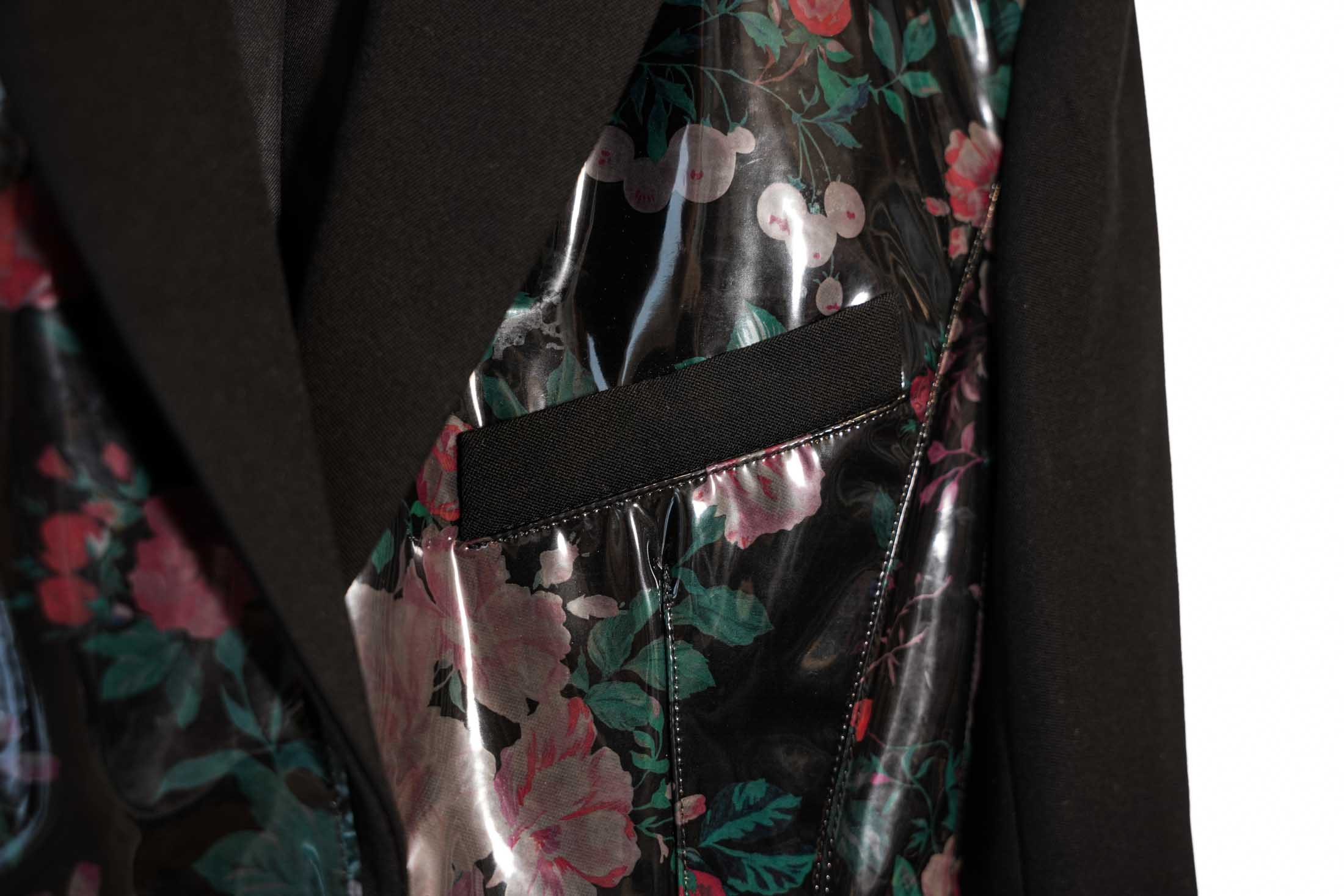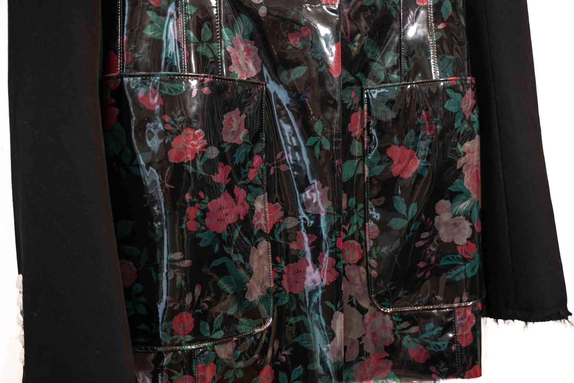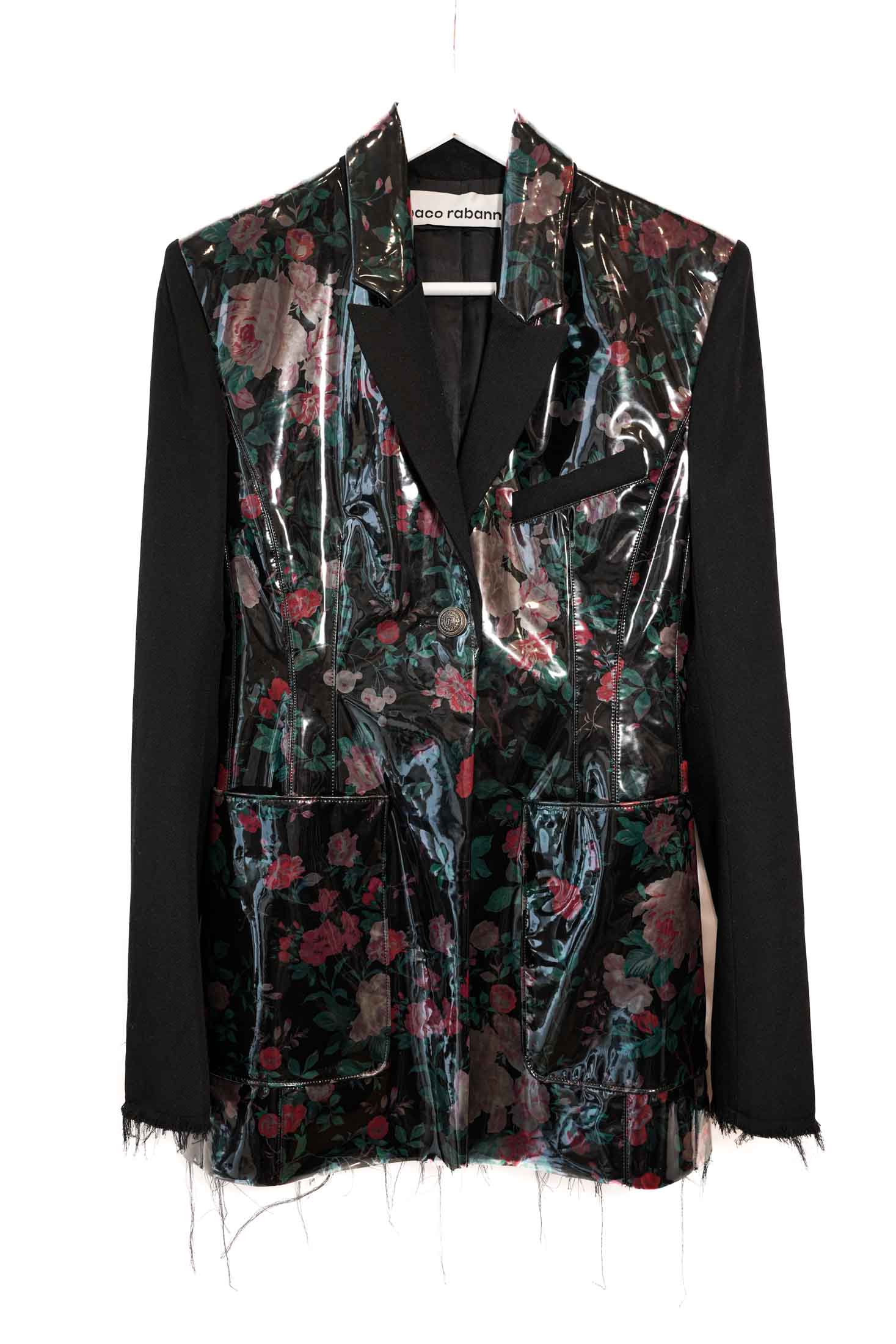 Veste PACO RABANNE en laine noire et plastique fleuri.