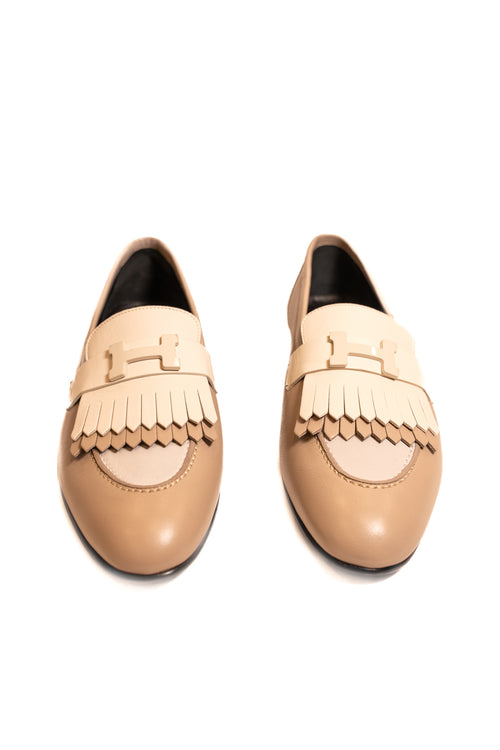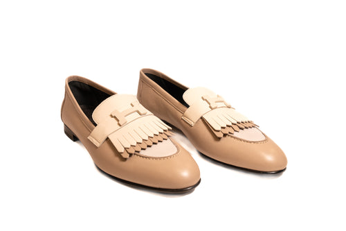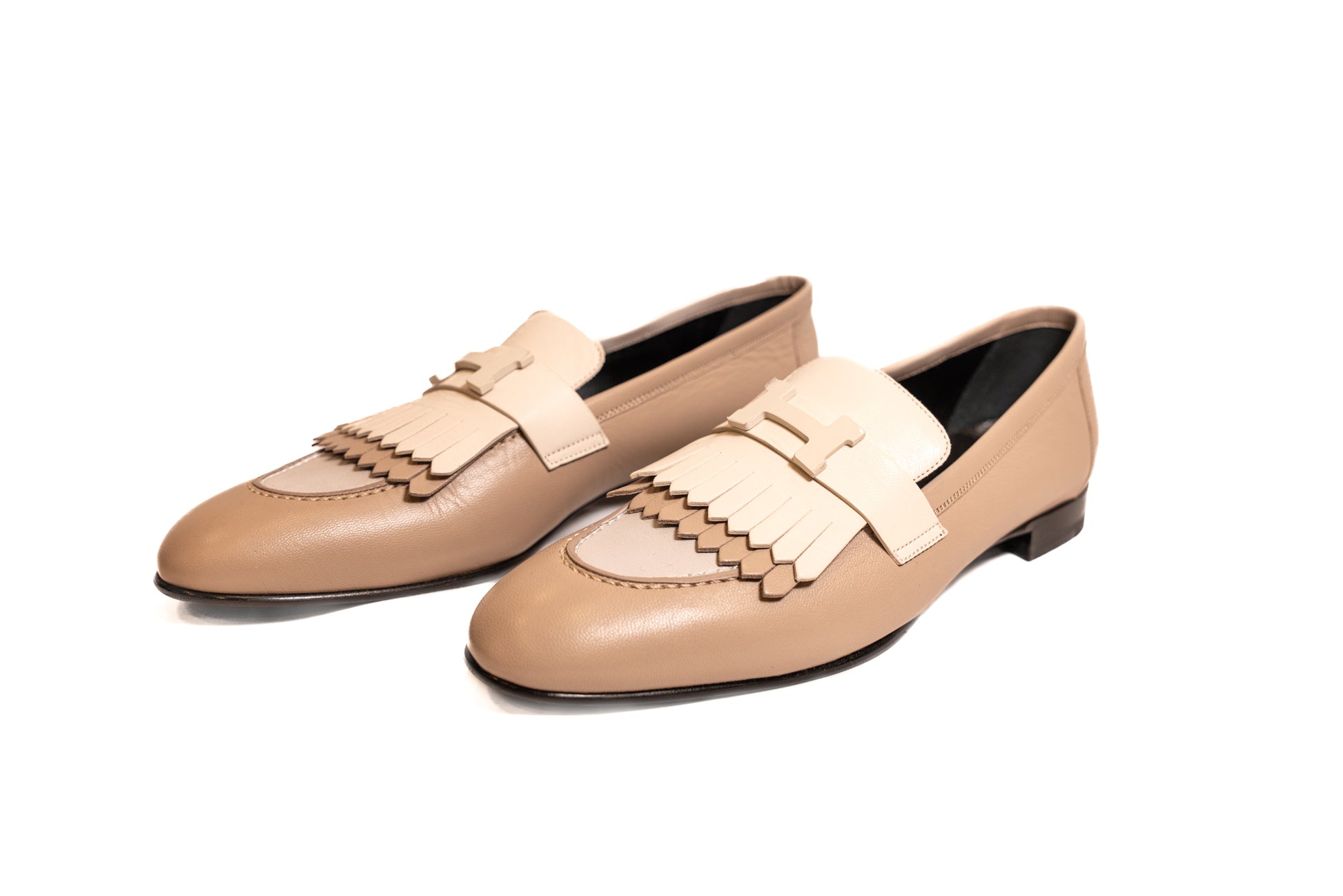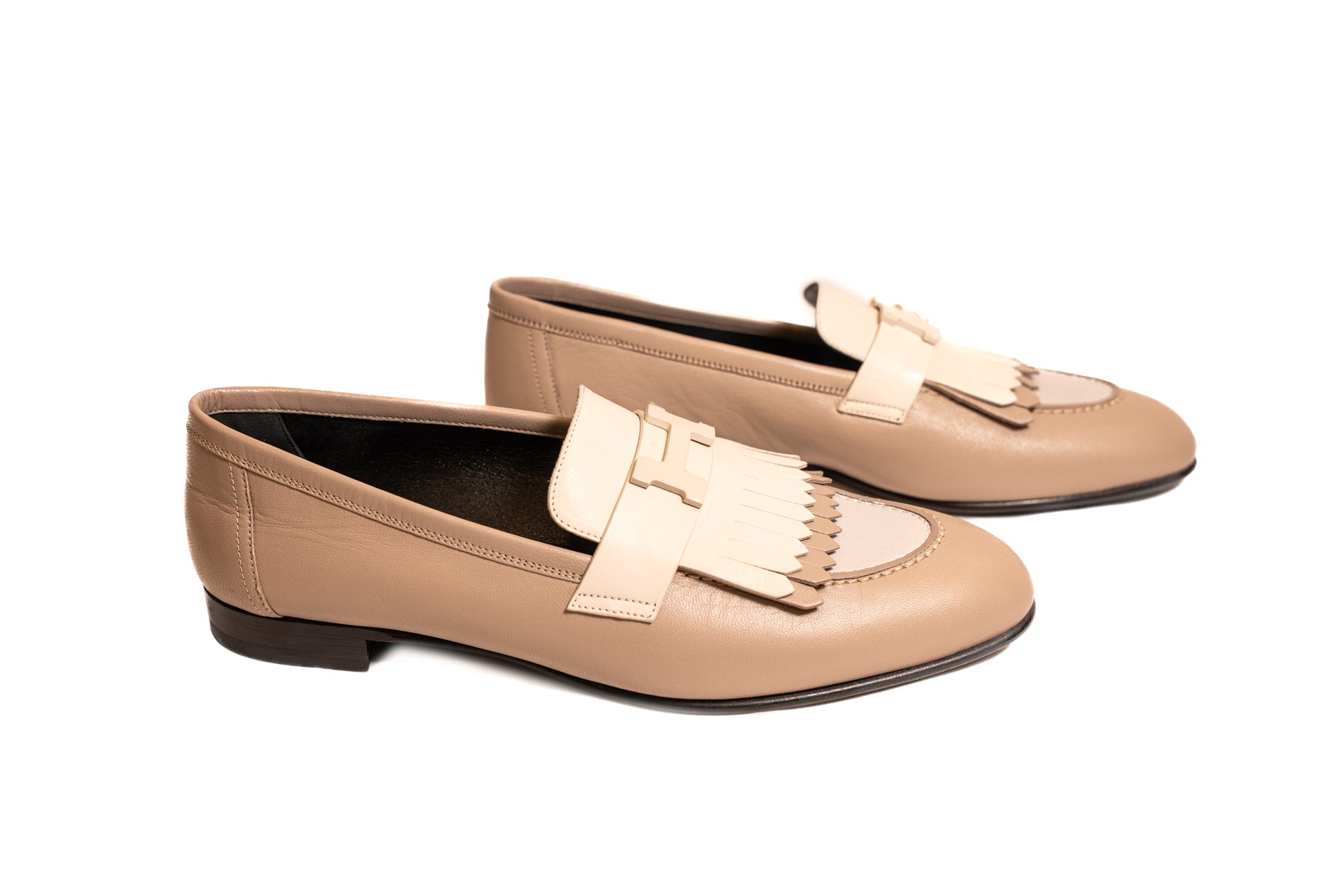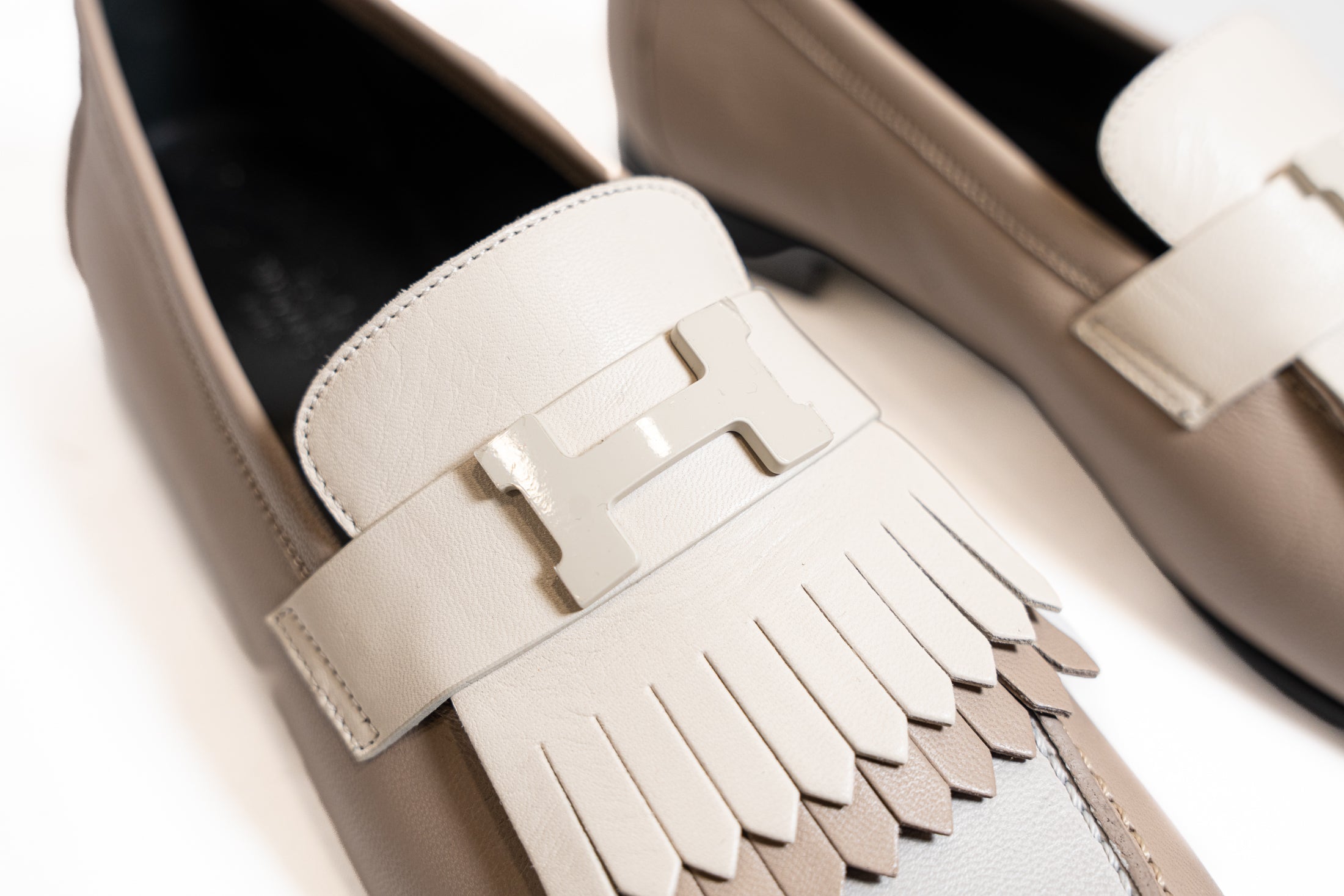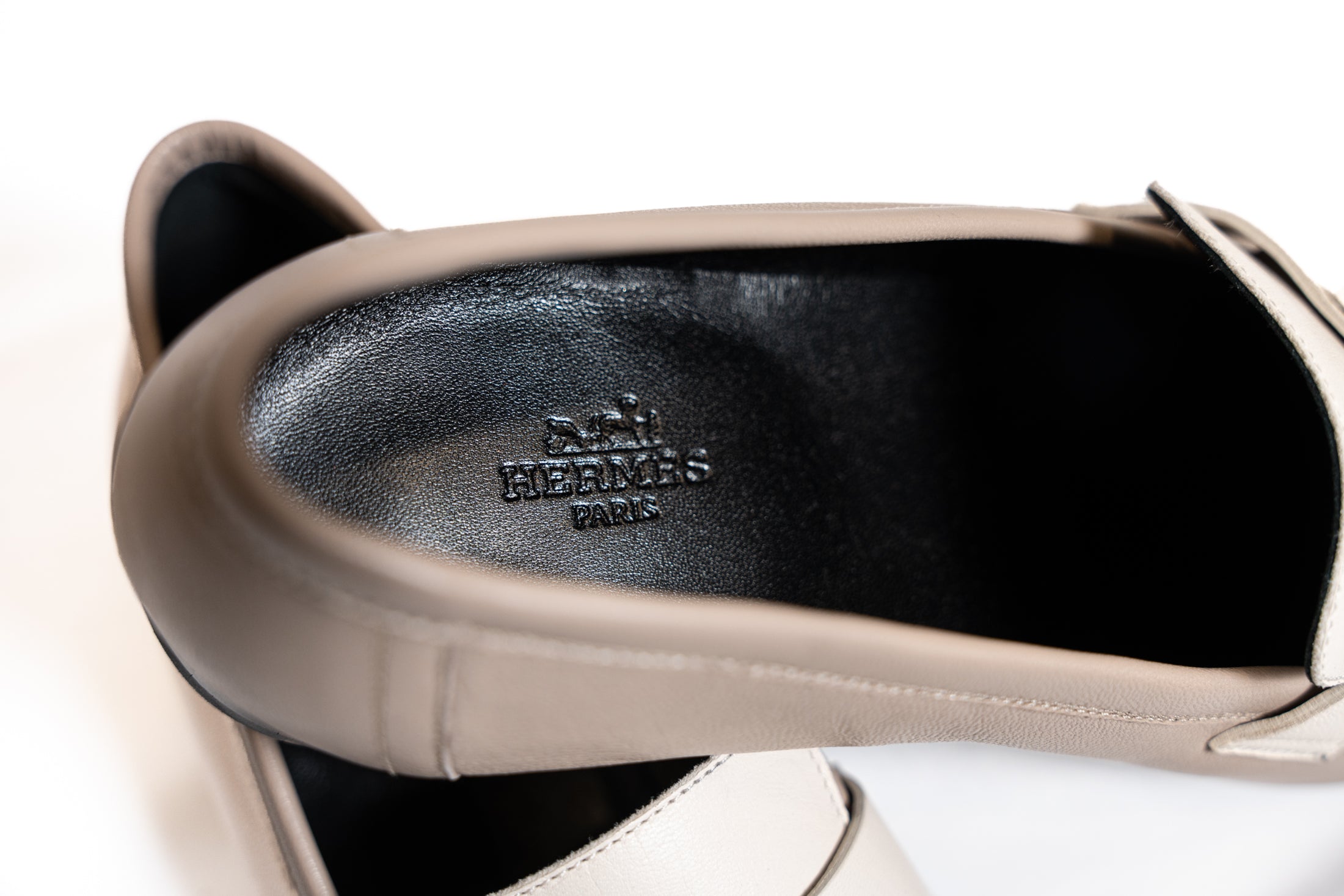 Mocassins HERMES gris perle et blanc. Modèle Royal. Neufs, provient des soldes.