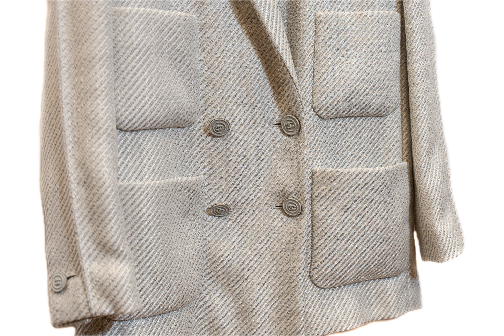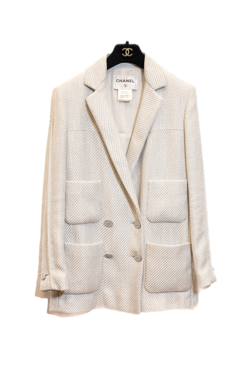 Veste croisée CHANEL en tweed blanc irisé.