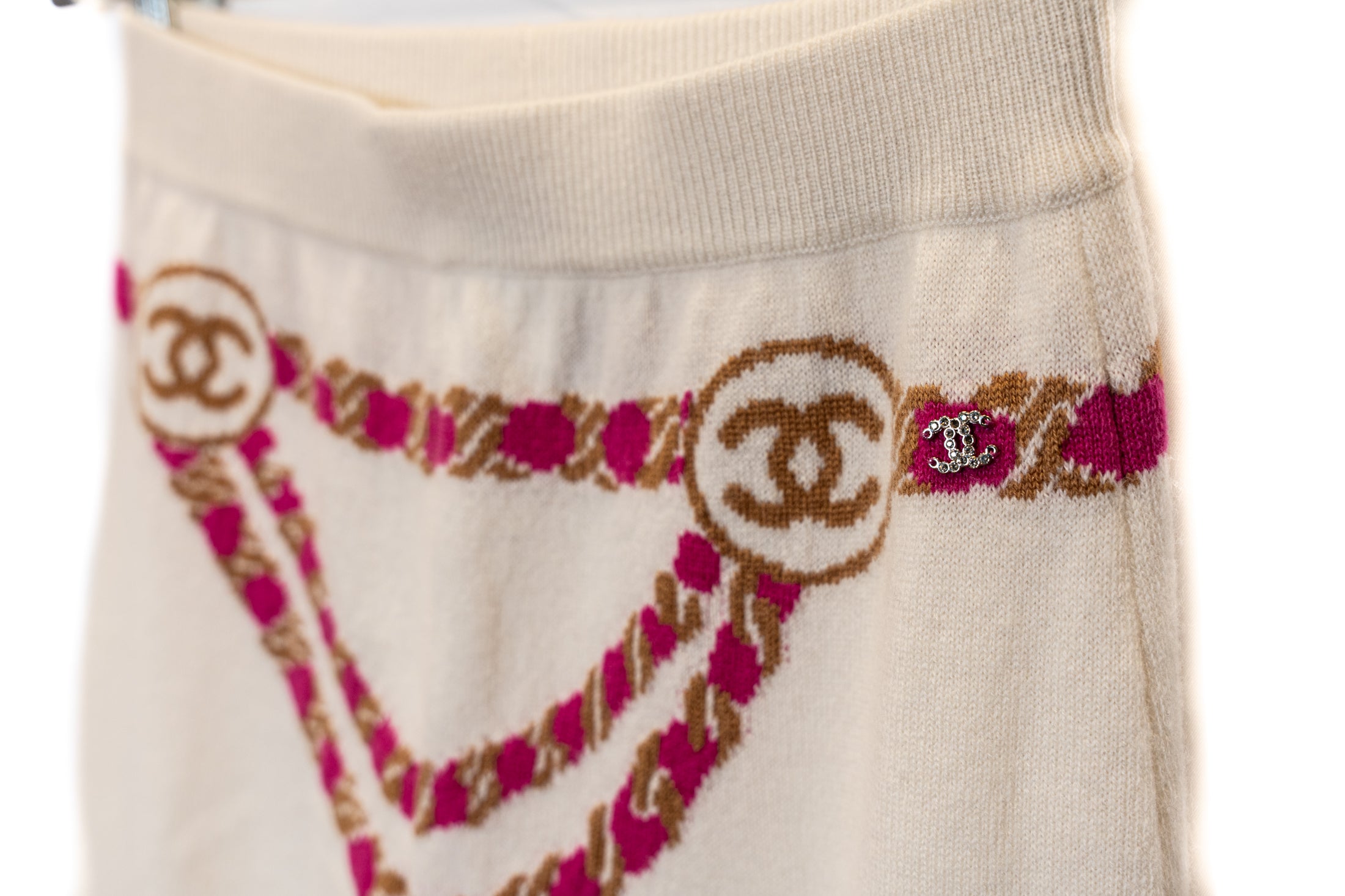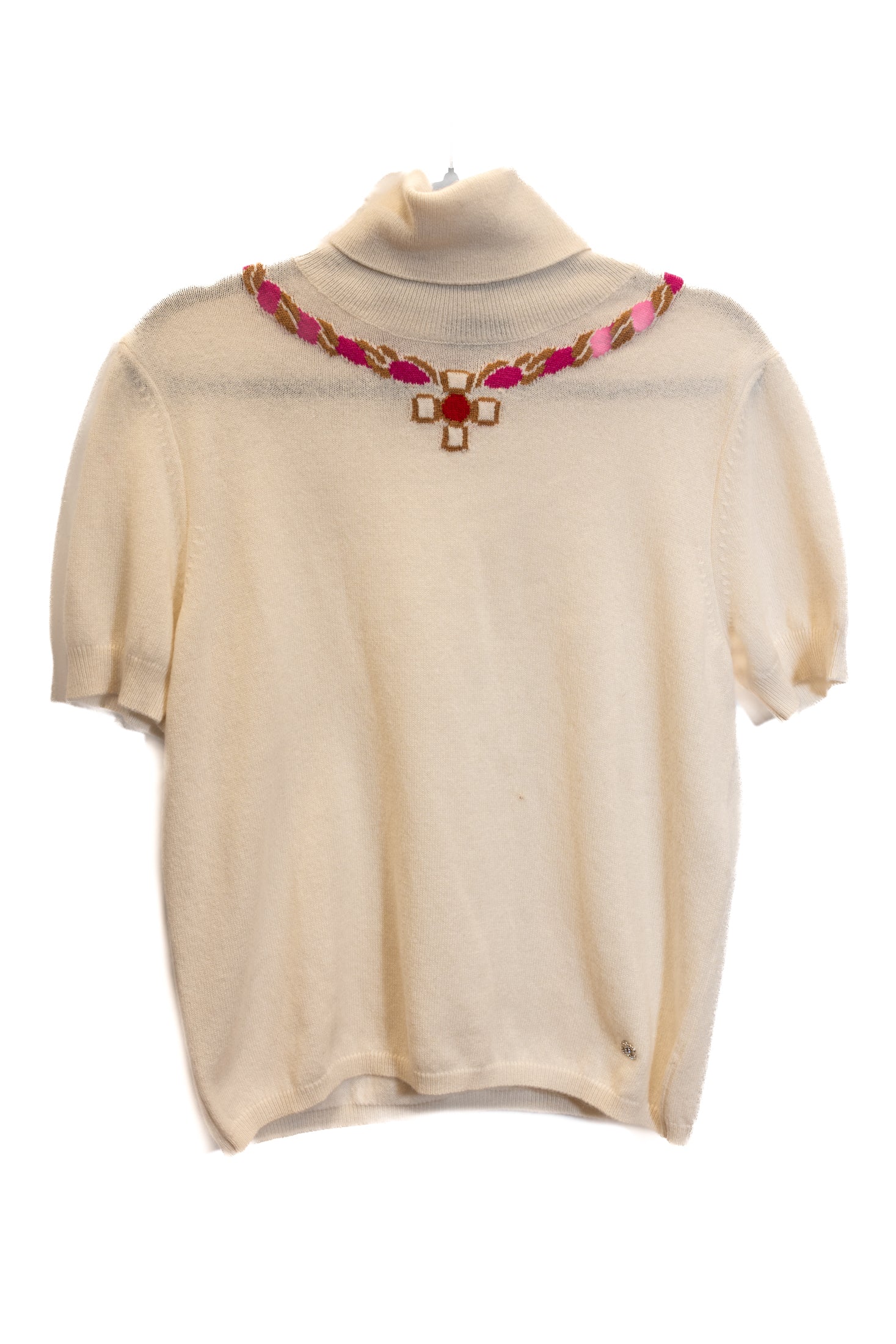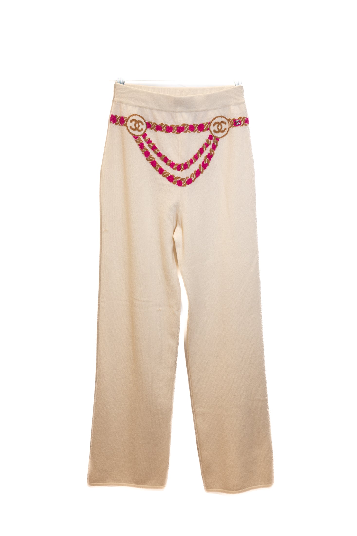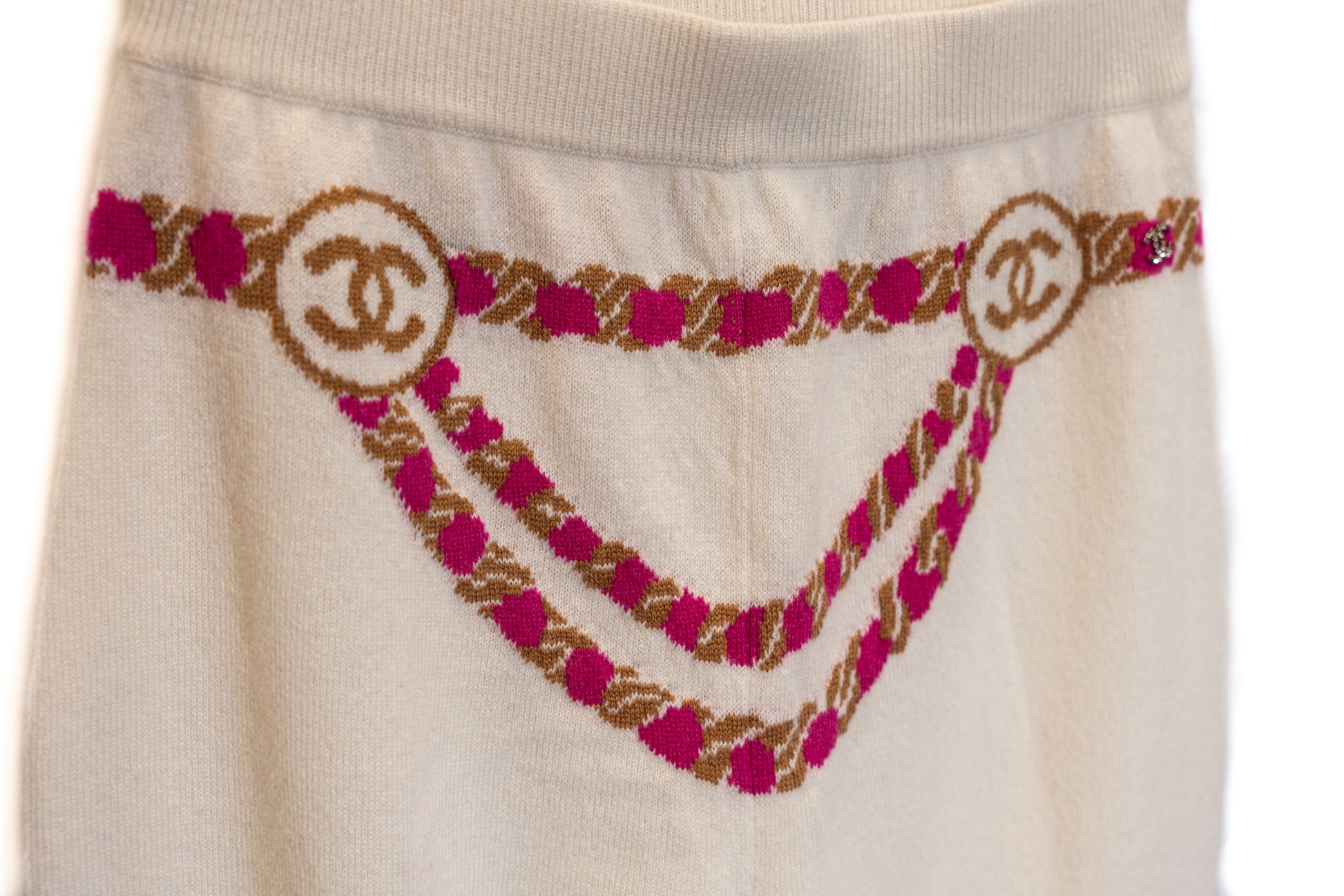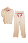Pull manches courtes et Pantalon CHANEL en cachemire. Décoration collier sur le pull. Le pantalon est orné d'une ceinture décorative de couleur rose.