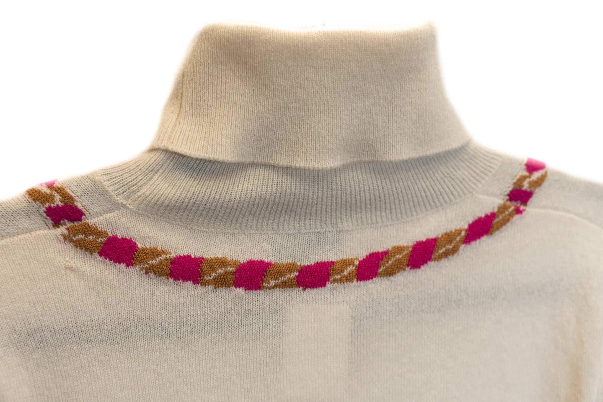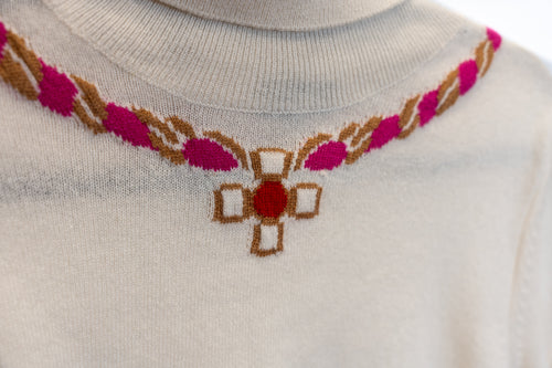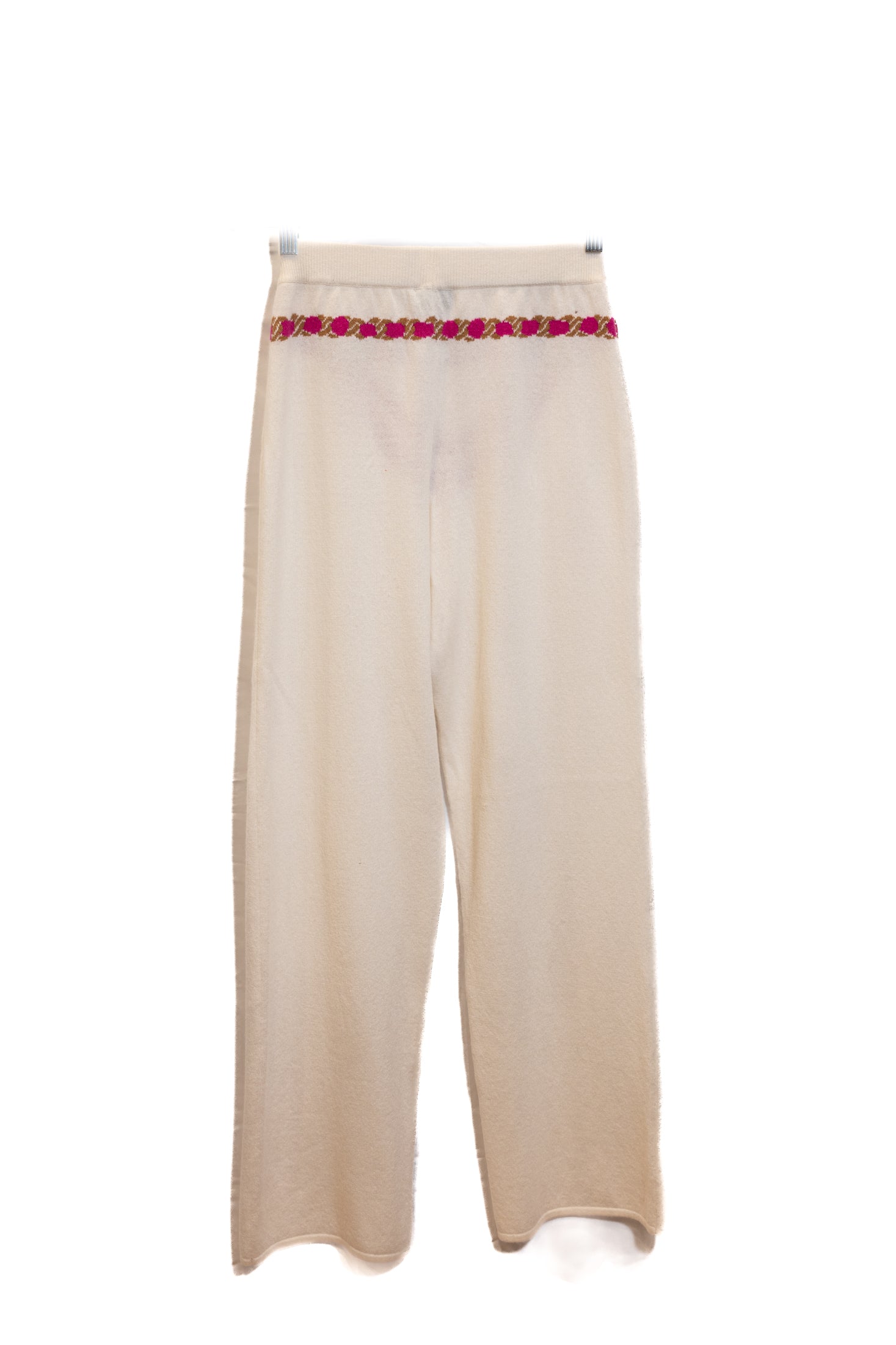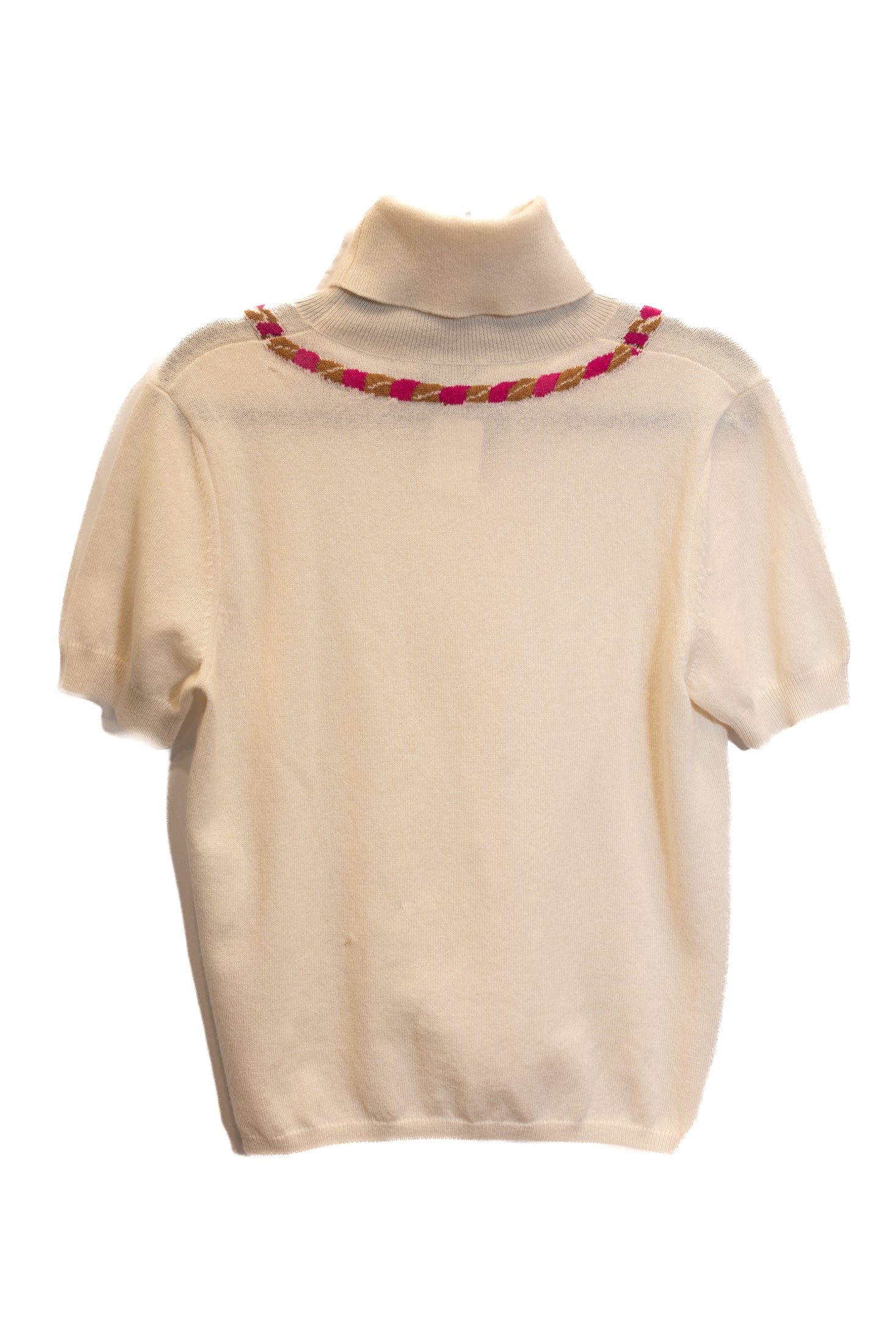 Pull manches courtes et Pantalon CHANEL en cachemire. Décoration collier sur le pull. Le pantalon est orné d'une ceinture décorative de couleur rose.