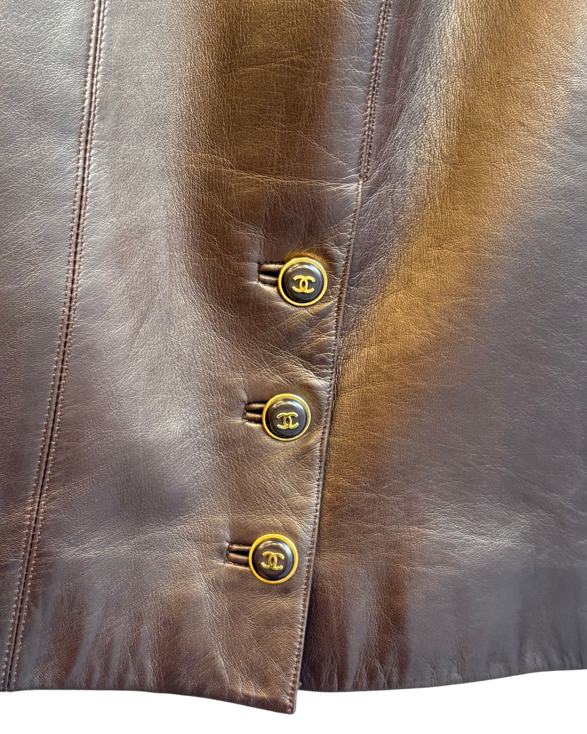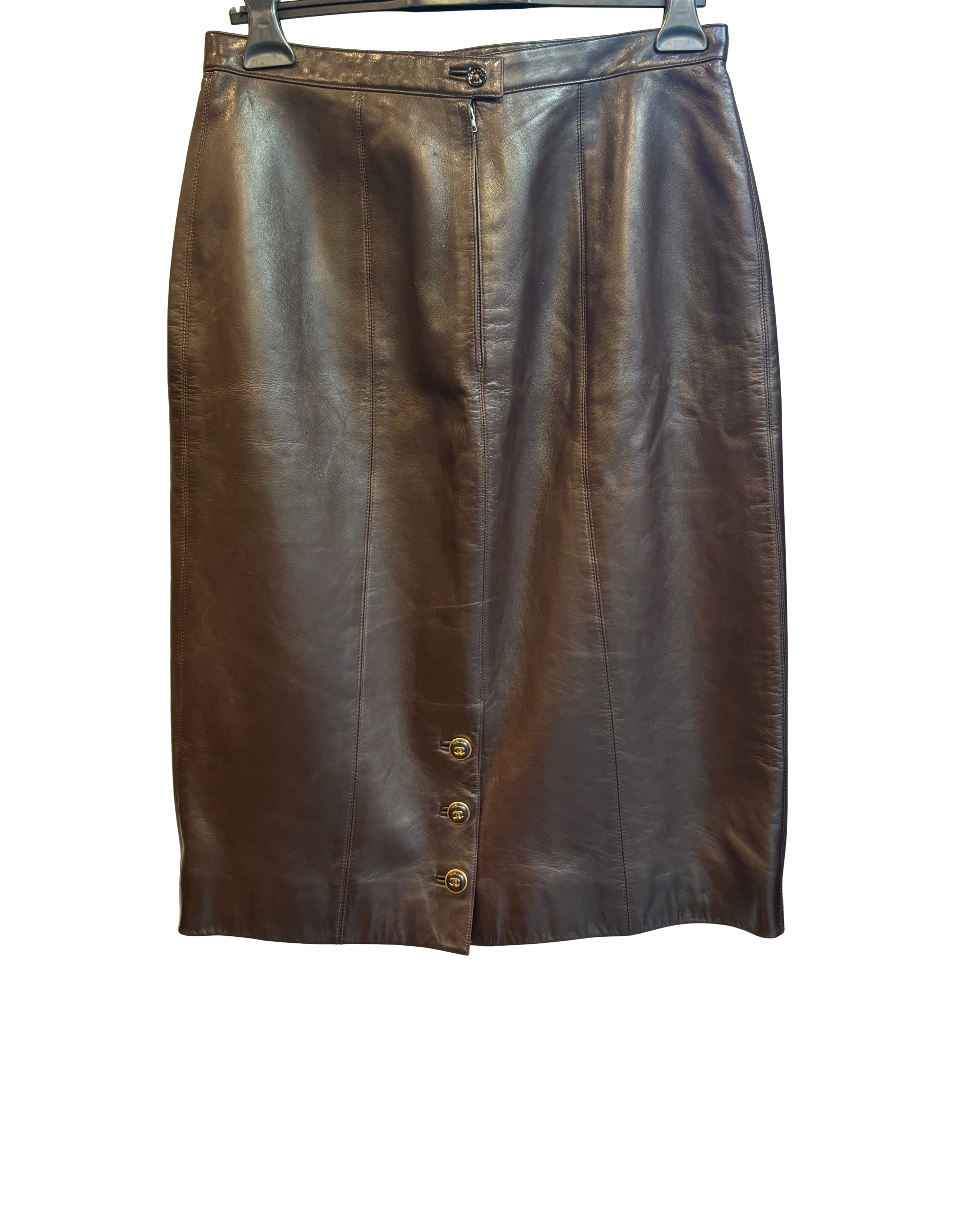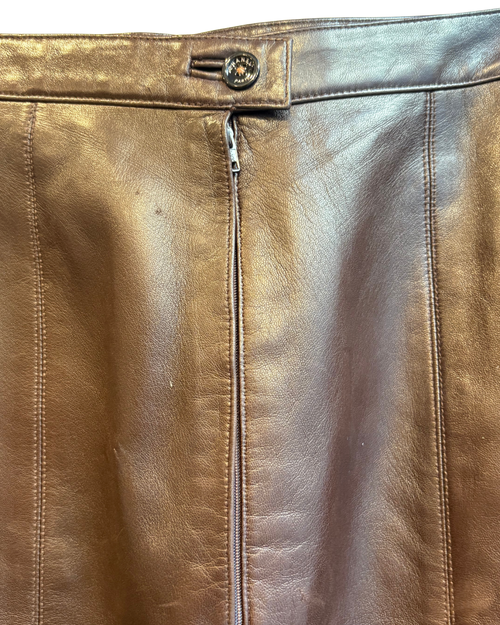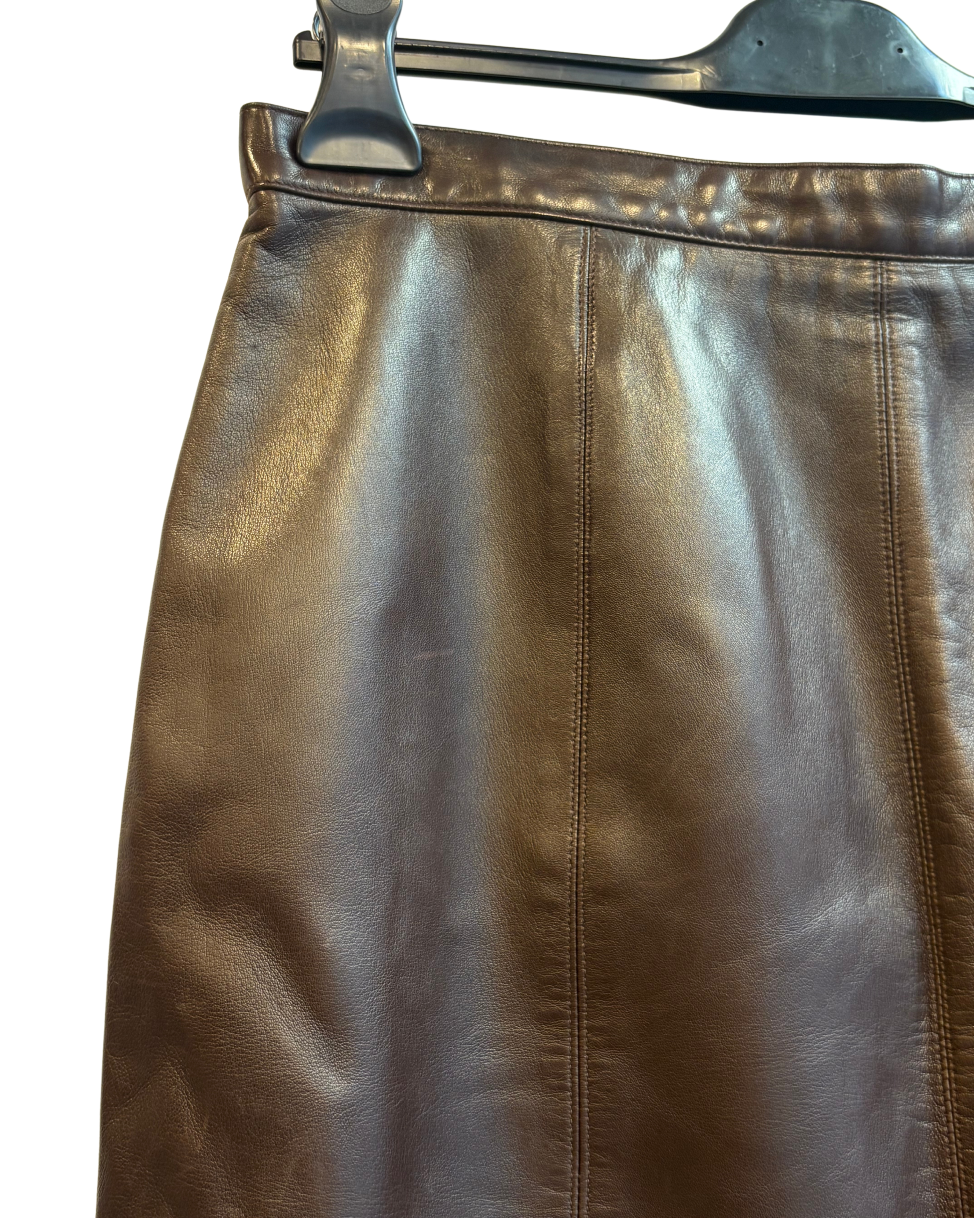 Magnifique jupe Chanel vintage en cuir marron foncé en bon état général. Le cuir présente de léger signe d’usure.