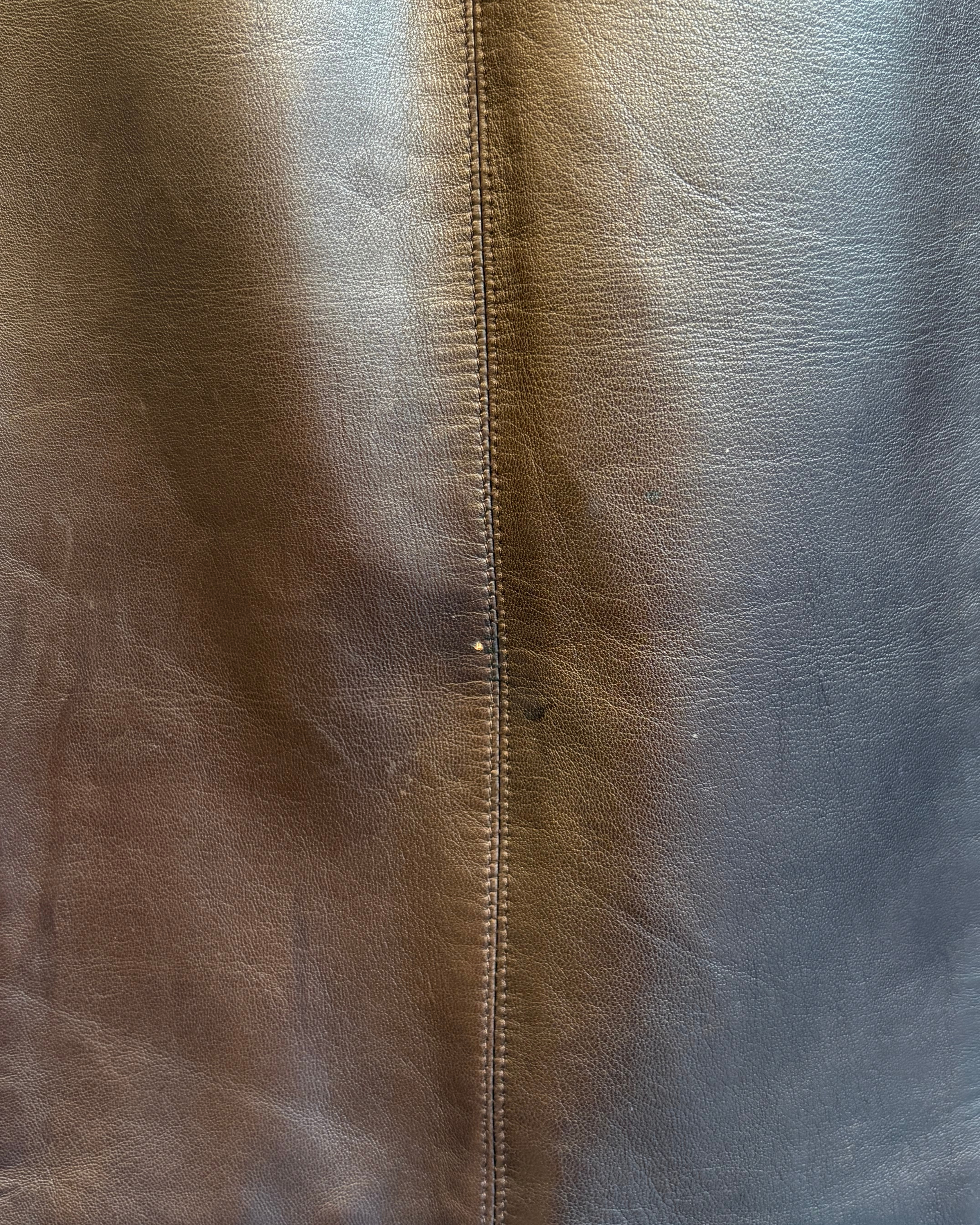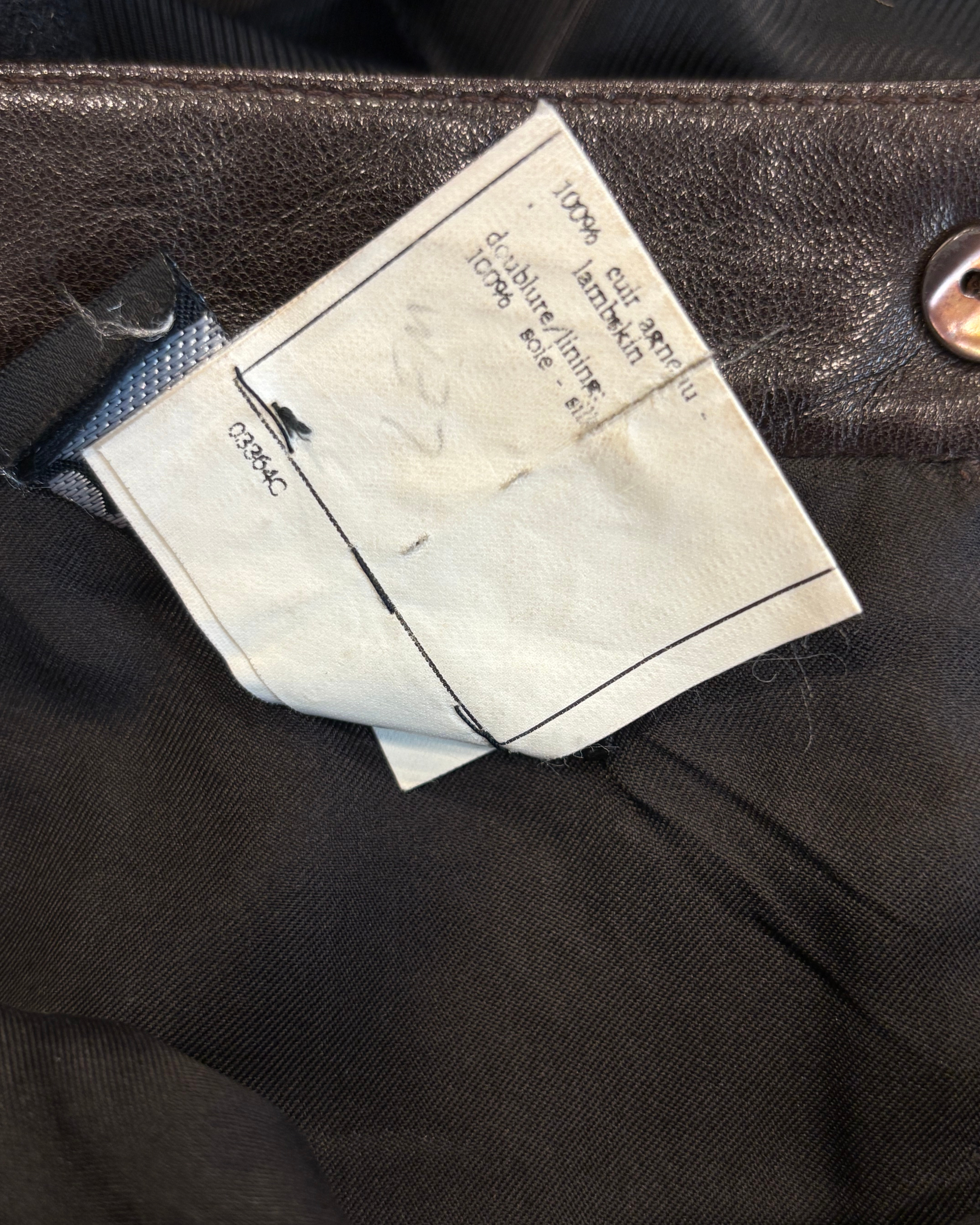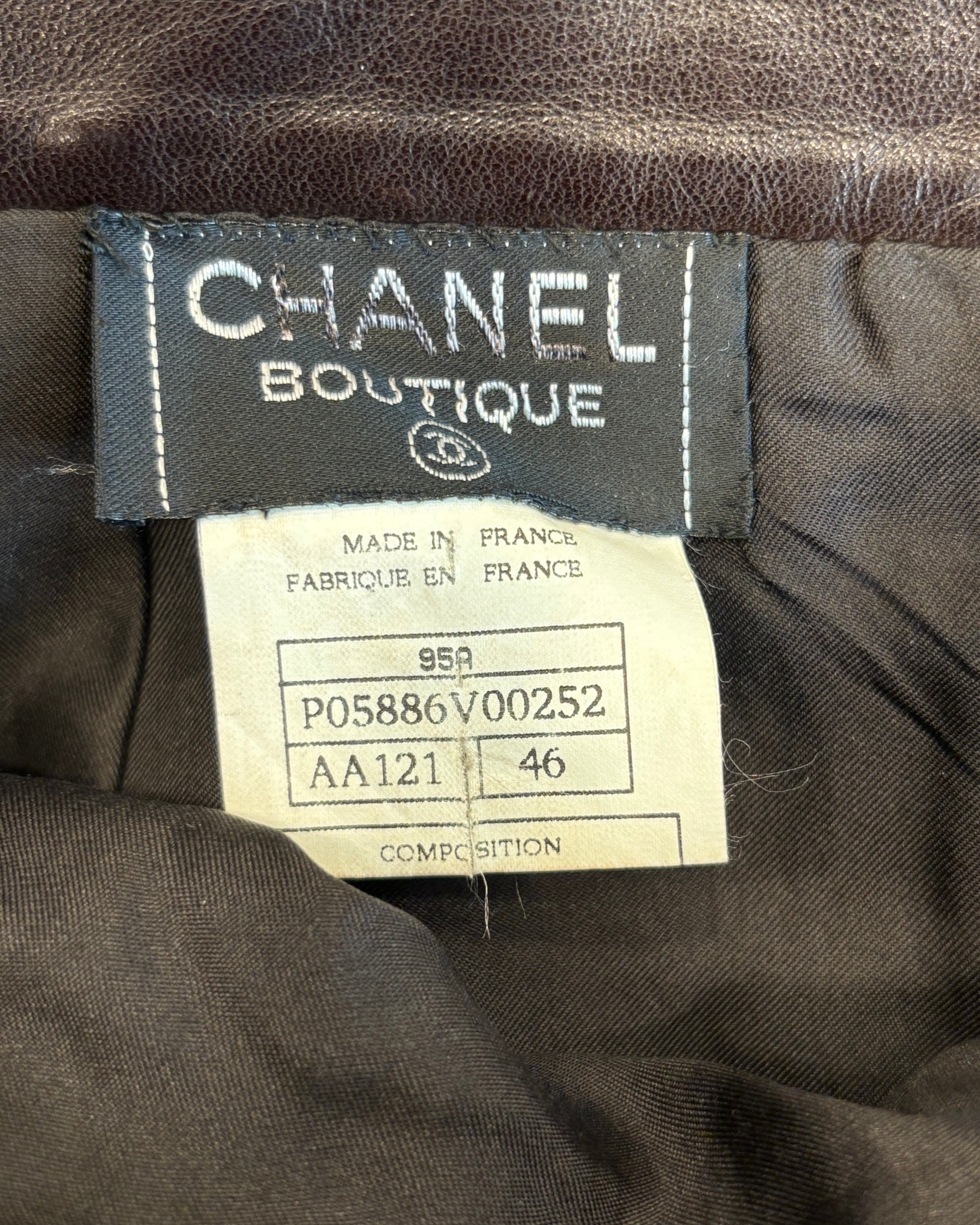 Magnifique jupe Chanel vintage en cuir marron foncé en bon état général. Le cuir présente de léger signe d’usure.