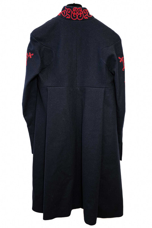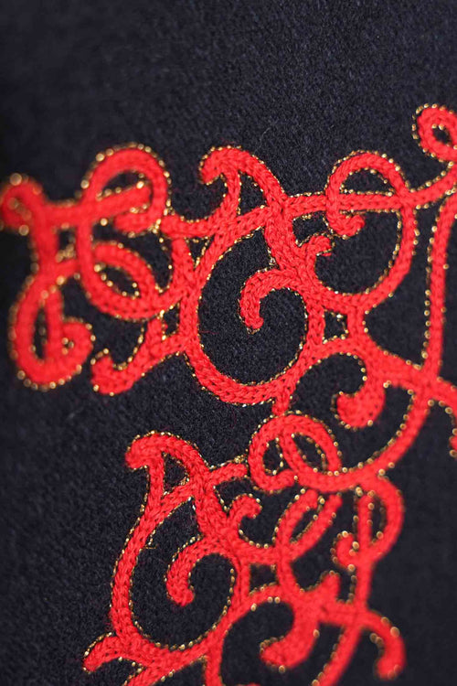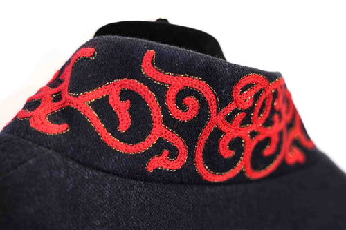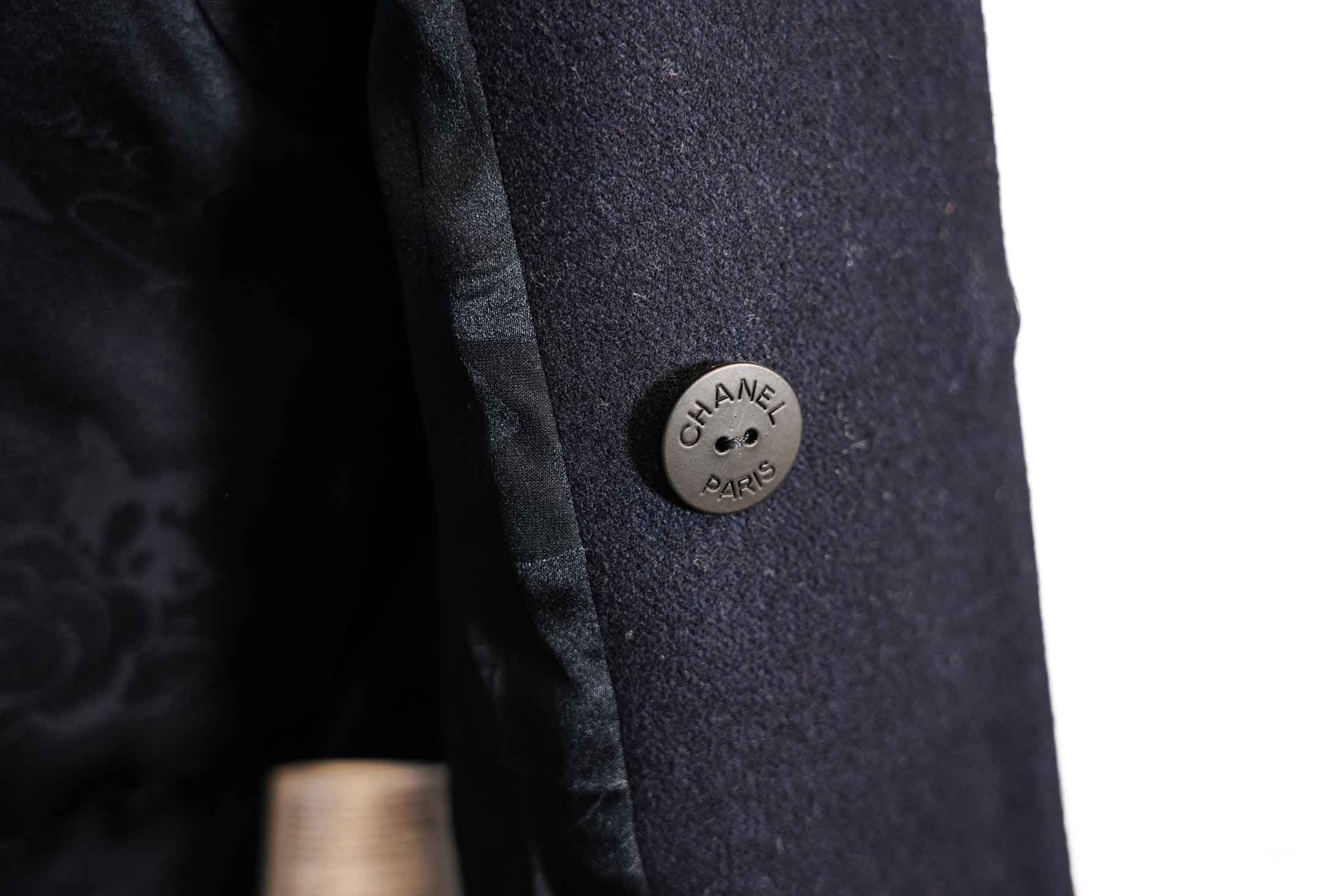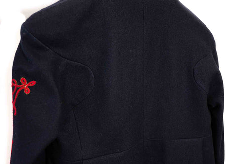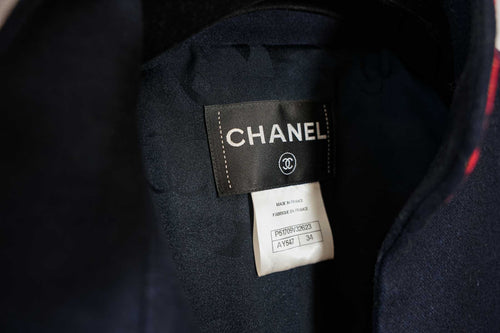 Ce manteau Chanel en laine marine, issu de la Salzburg Collection métiers d'art, se distingue par sa broderie rouge raffinée et sa coupe structurée. Une pièce chic et classique, idéale pour un style raffiné et sophistiqué en toutes occasions.