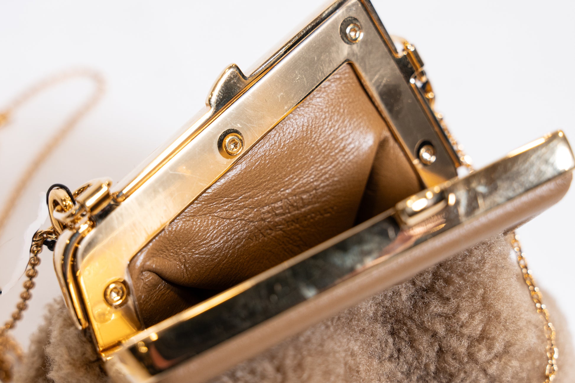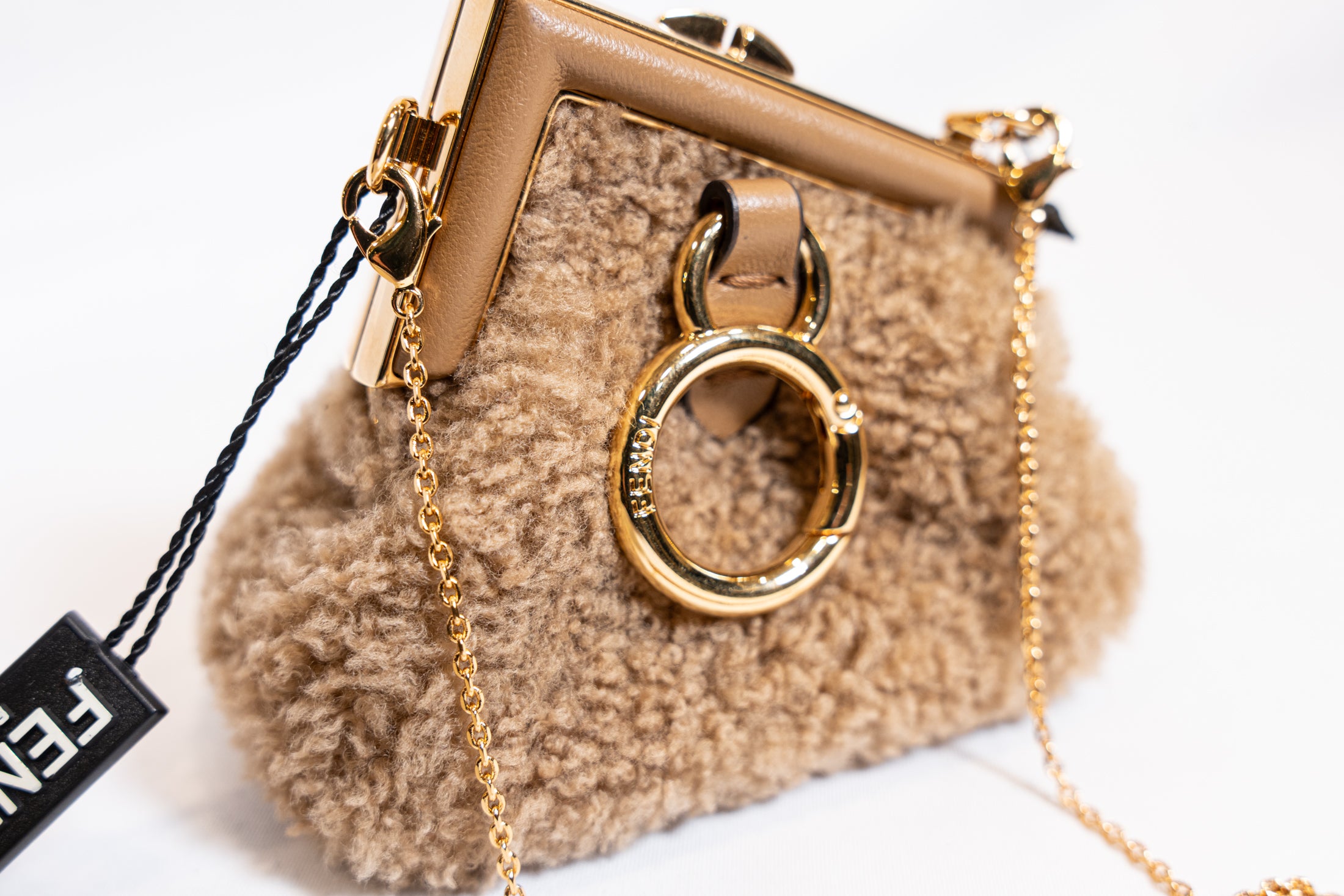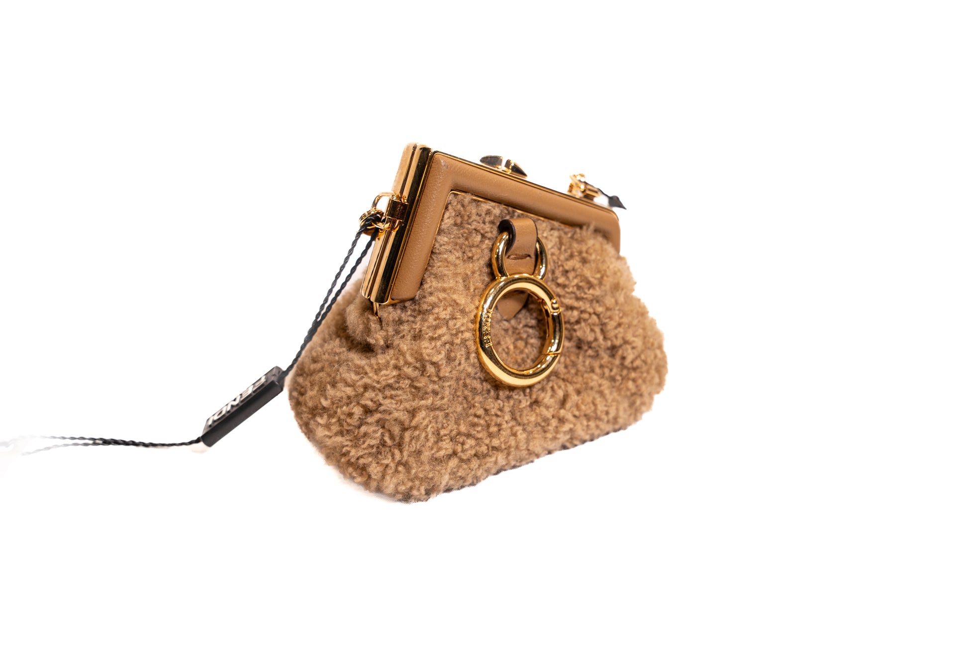 Micro sac FENDI en fourrure. L'intérieur est doublé en cuir. Peut se porter en collier ou en bandoulière. Full set de son dustbag et boîte d'origine