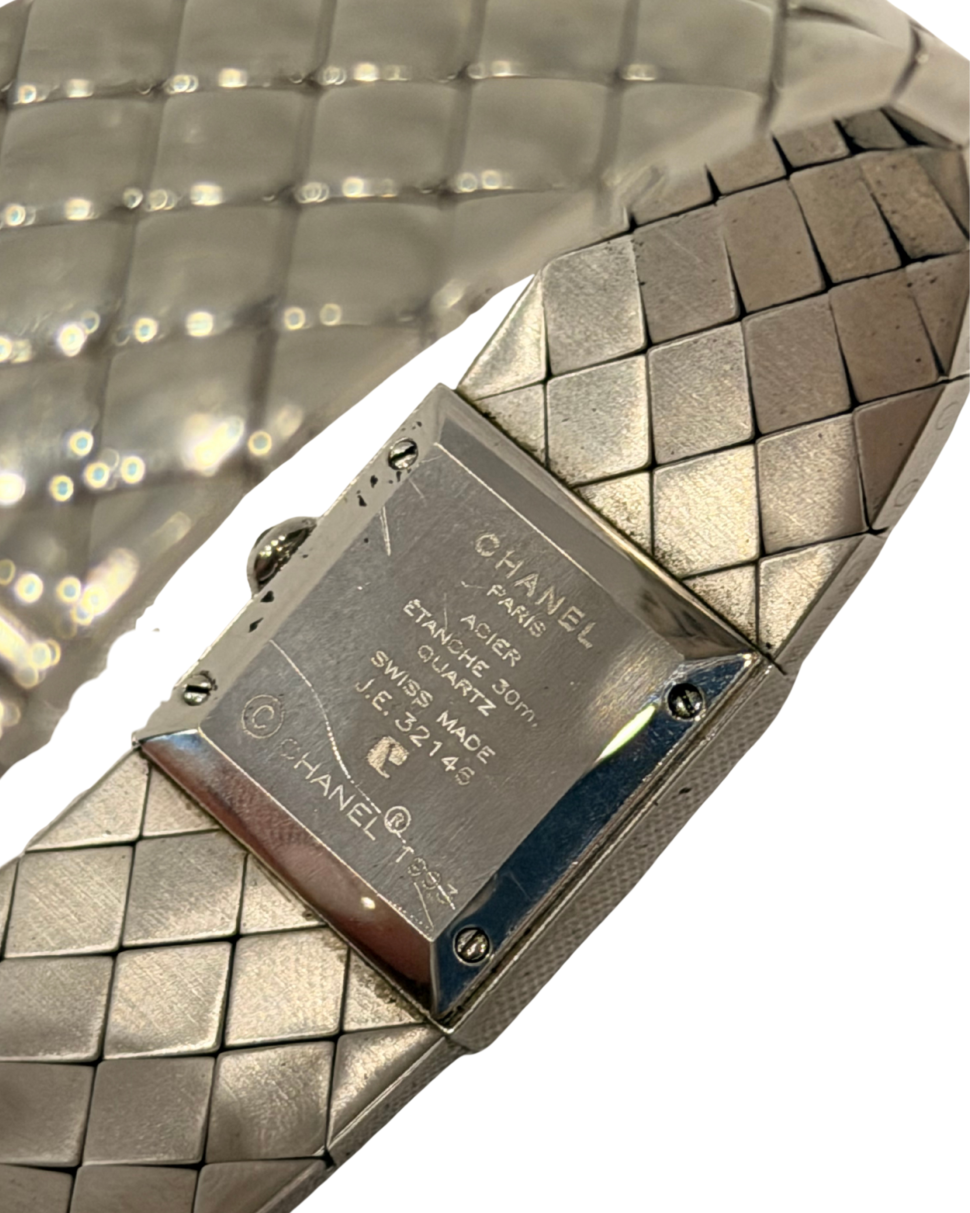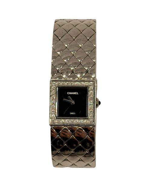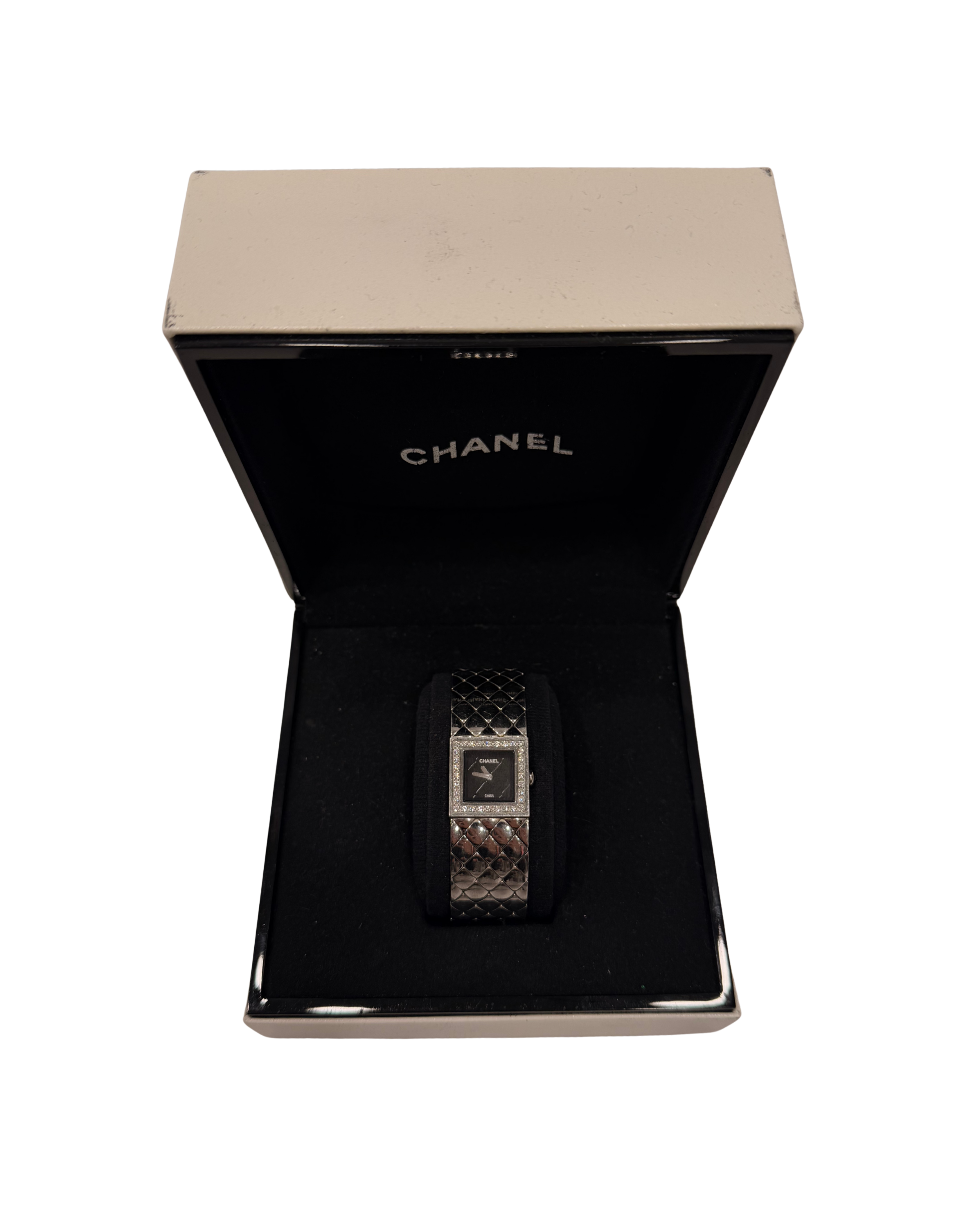 Boitier carré, lunette sertie de 32 diamants de taille moderne en serti grain de 0,01 carat chaque, couronne sertie d'un cabochon de pierre noire, fond vissé.