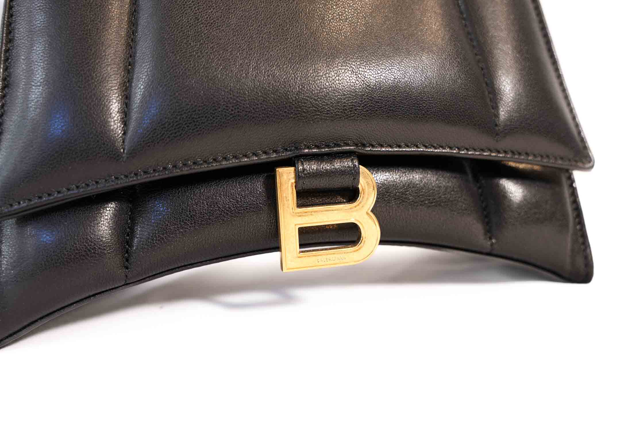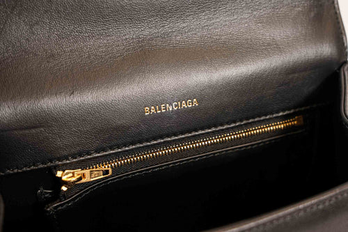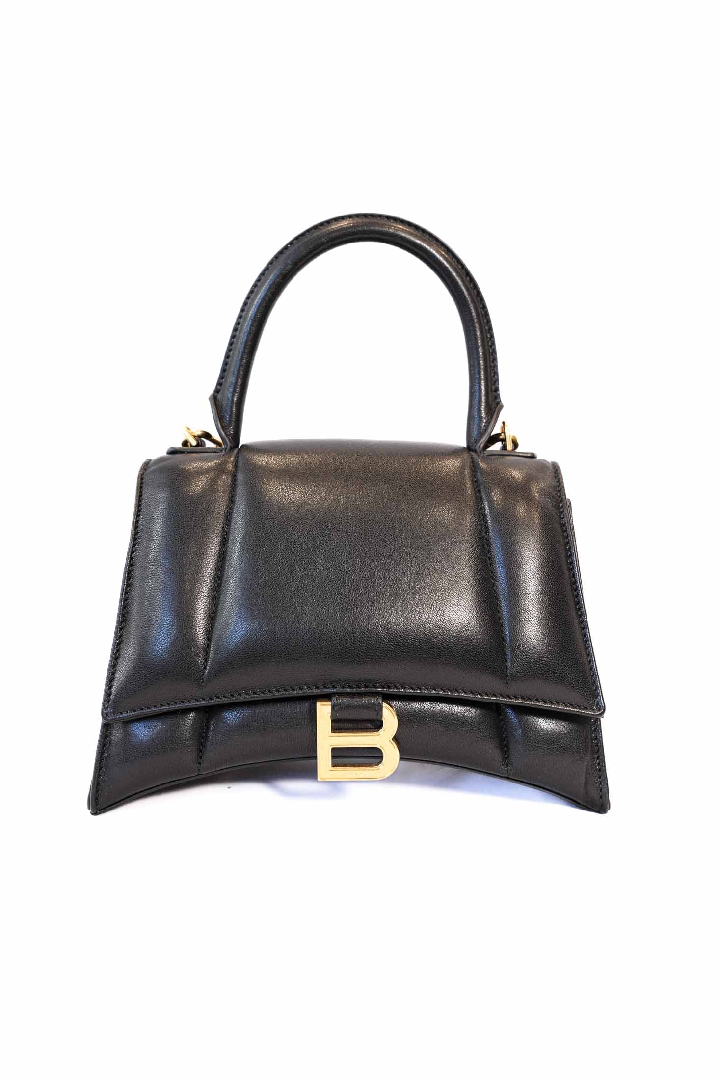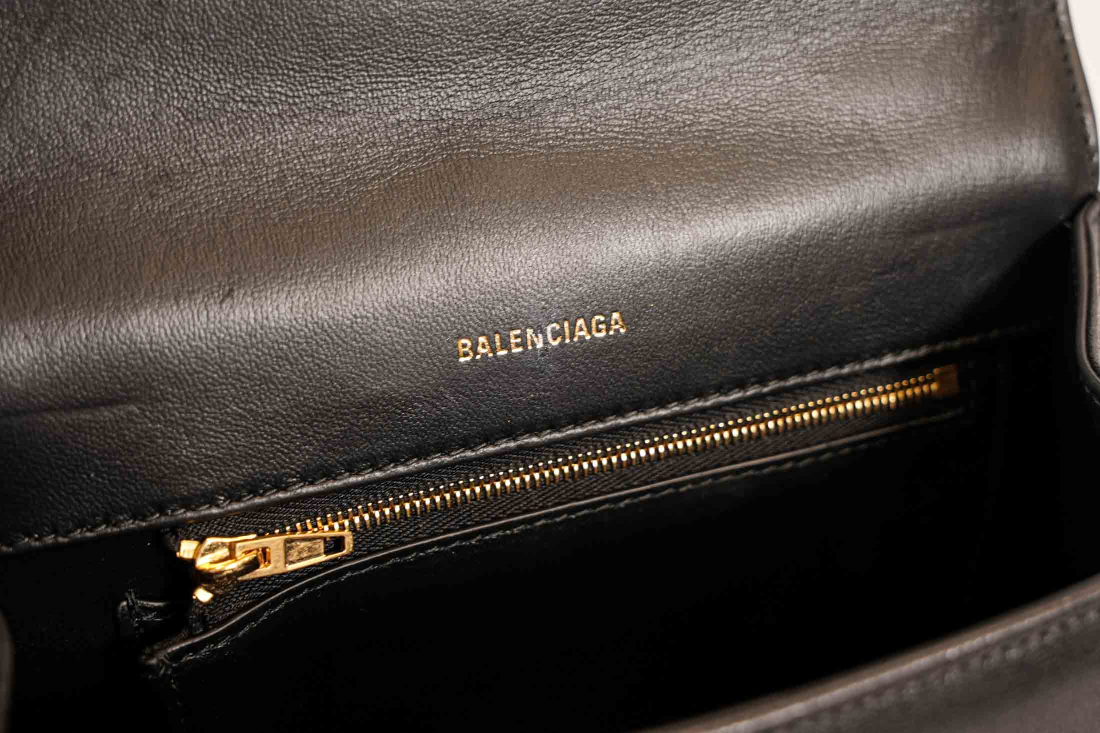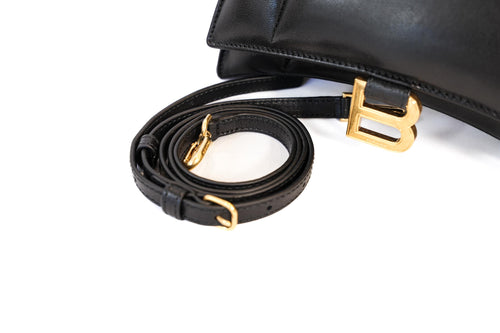 Sac BALENCIAGA modèle Hourglass en cuir de veau box noir brillant. Petit modèle avec bandoulière.