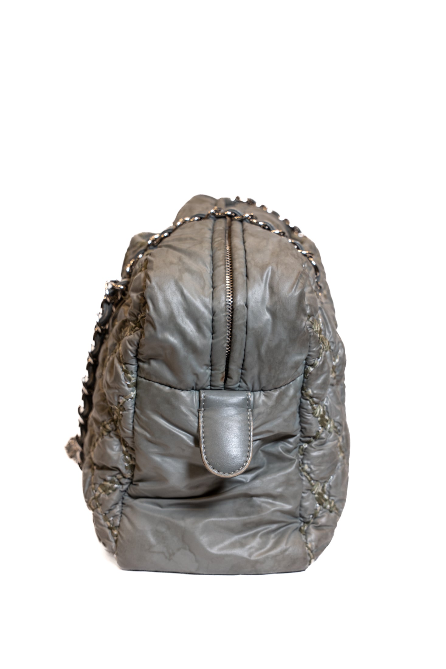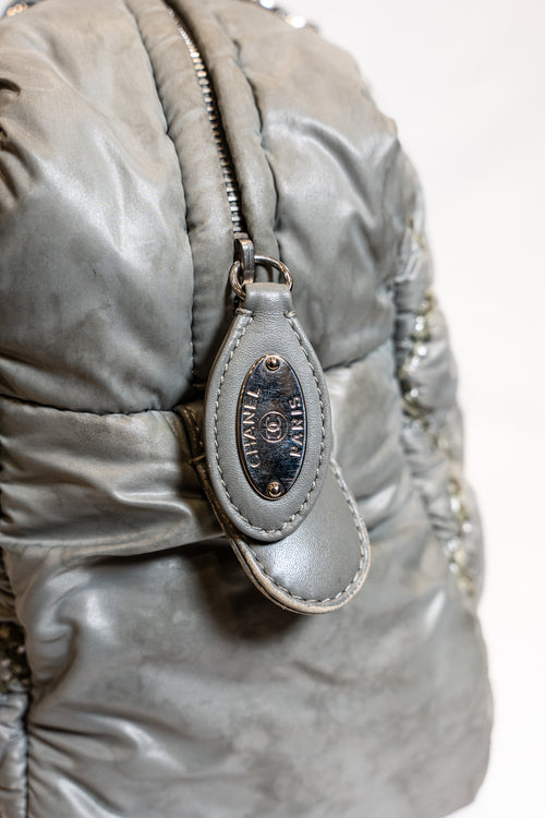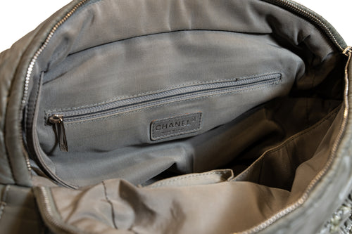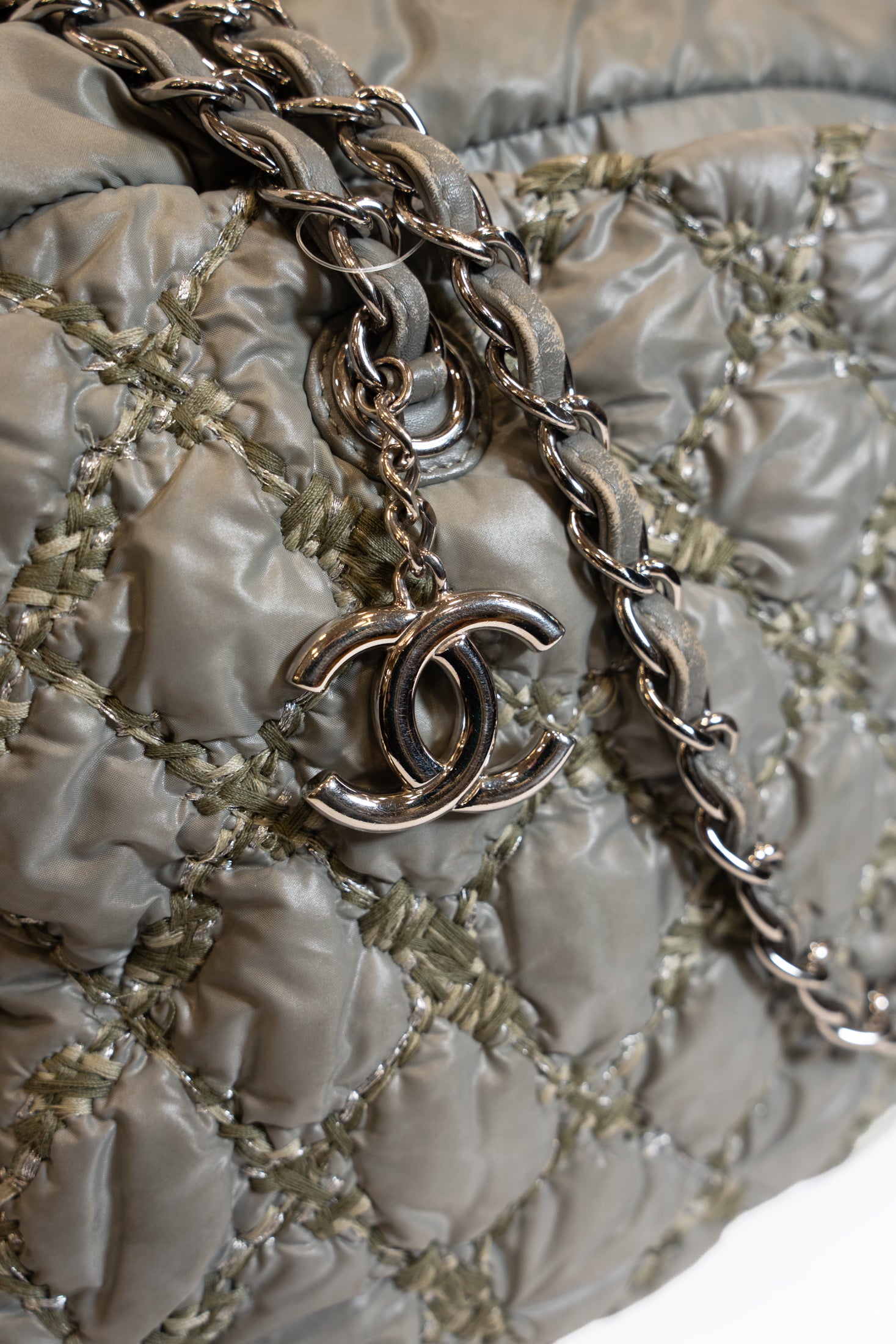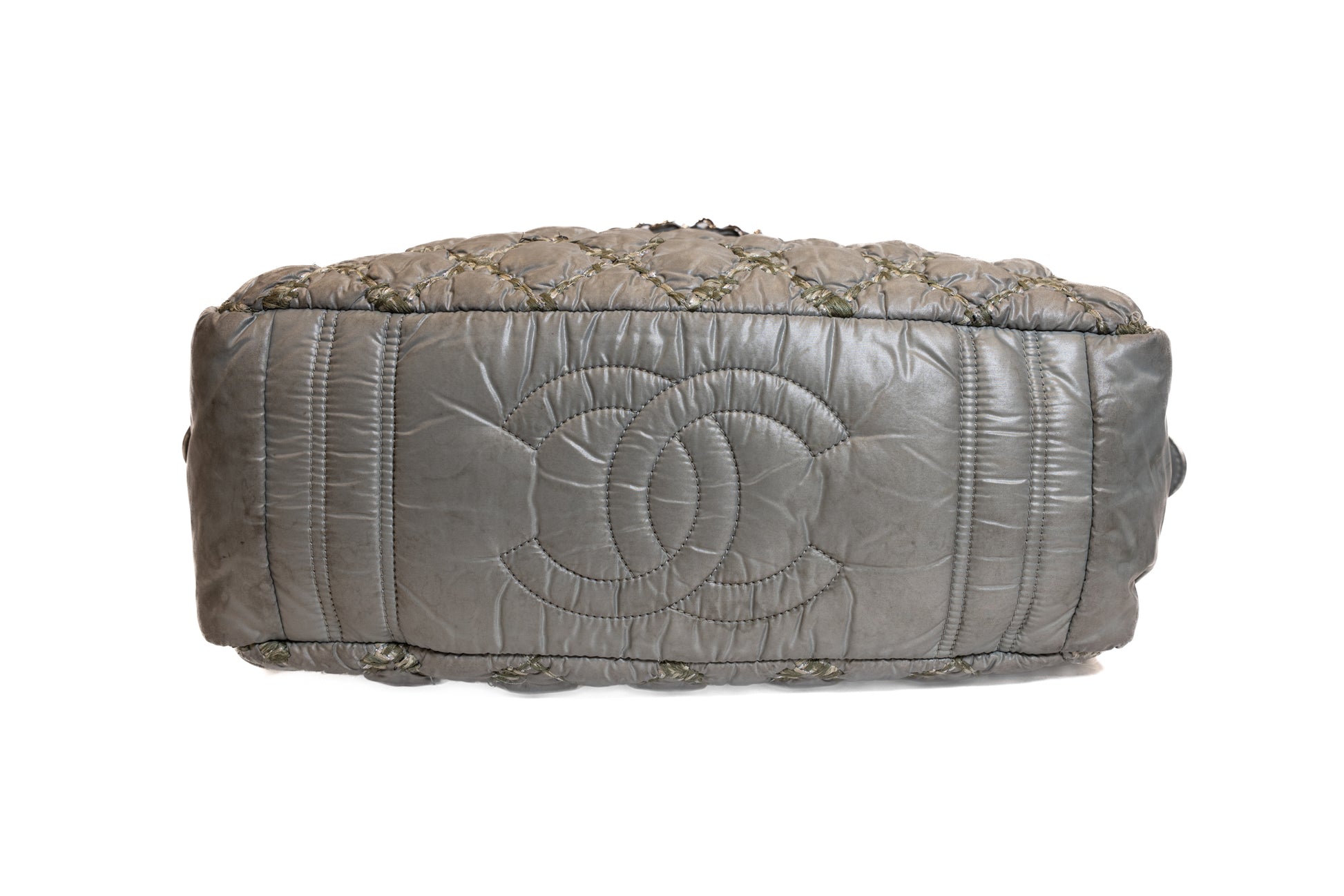 Sac fourre tout CHANEL en cuir plastifié vert à motifs.